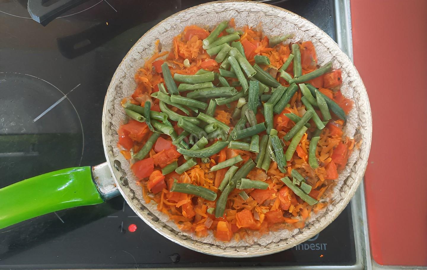 Высыпаю стручковую фасоль (свежую или замороженную).