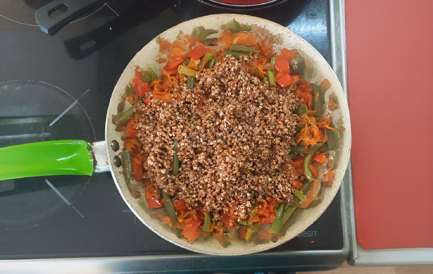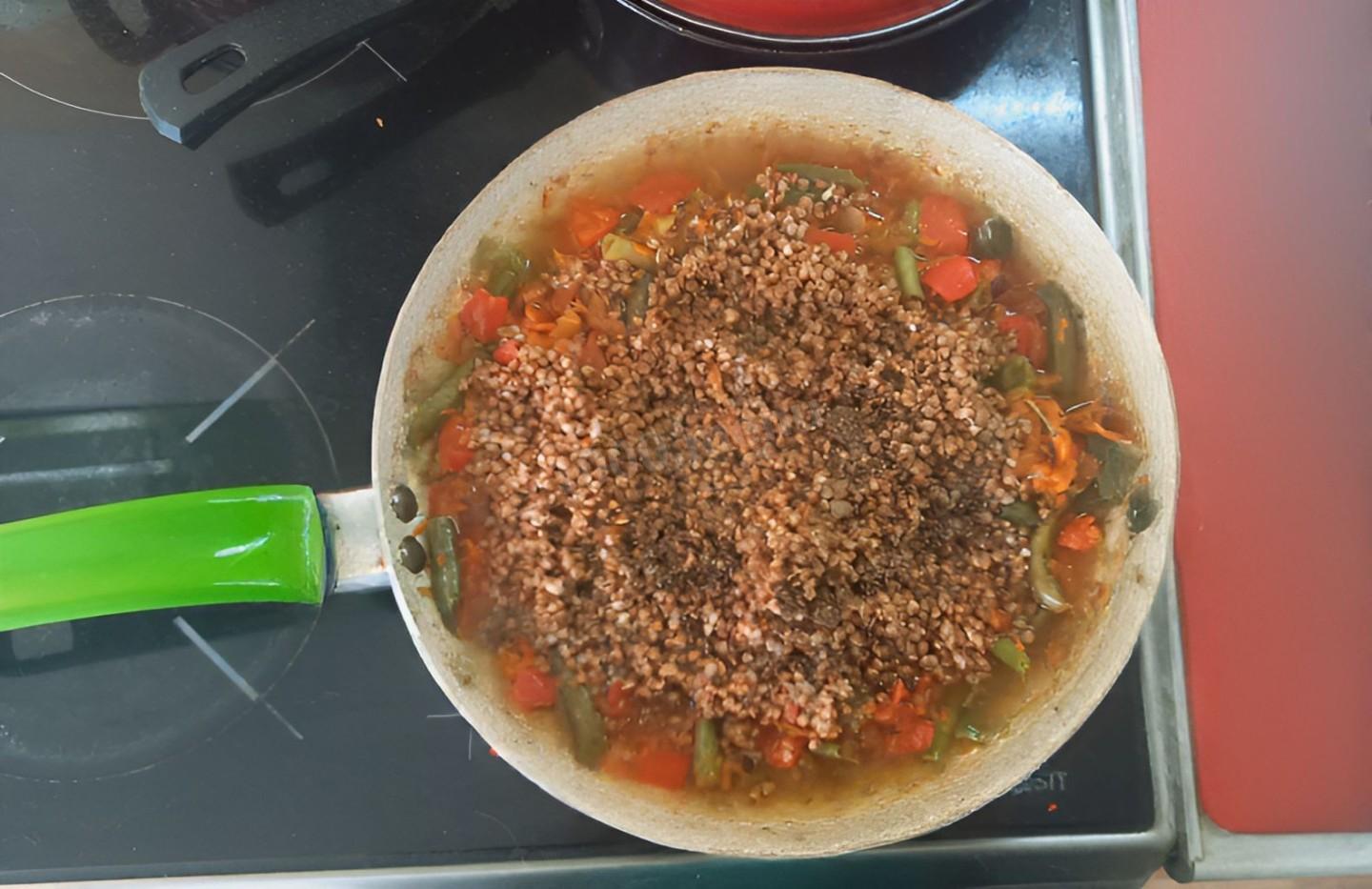 Выкладываю промытую гречку, равномерно распределив по поверхности овощей и накрываю крышкой. Томлю под крышкой 5 минут.