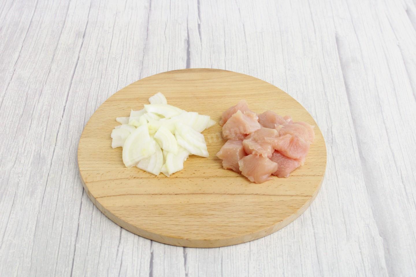 Репчатый лук очистите, сполосните. Нарежьте лук тонкими полукольцами. Курицу помойте, обсушите бумажными полотенцами. Если используете филе, нарежьте его небольшими кусочками.