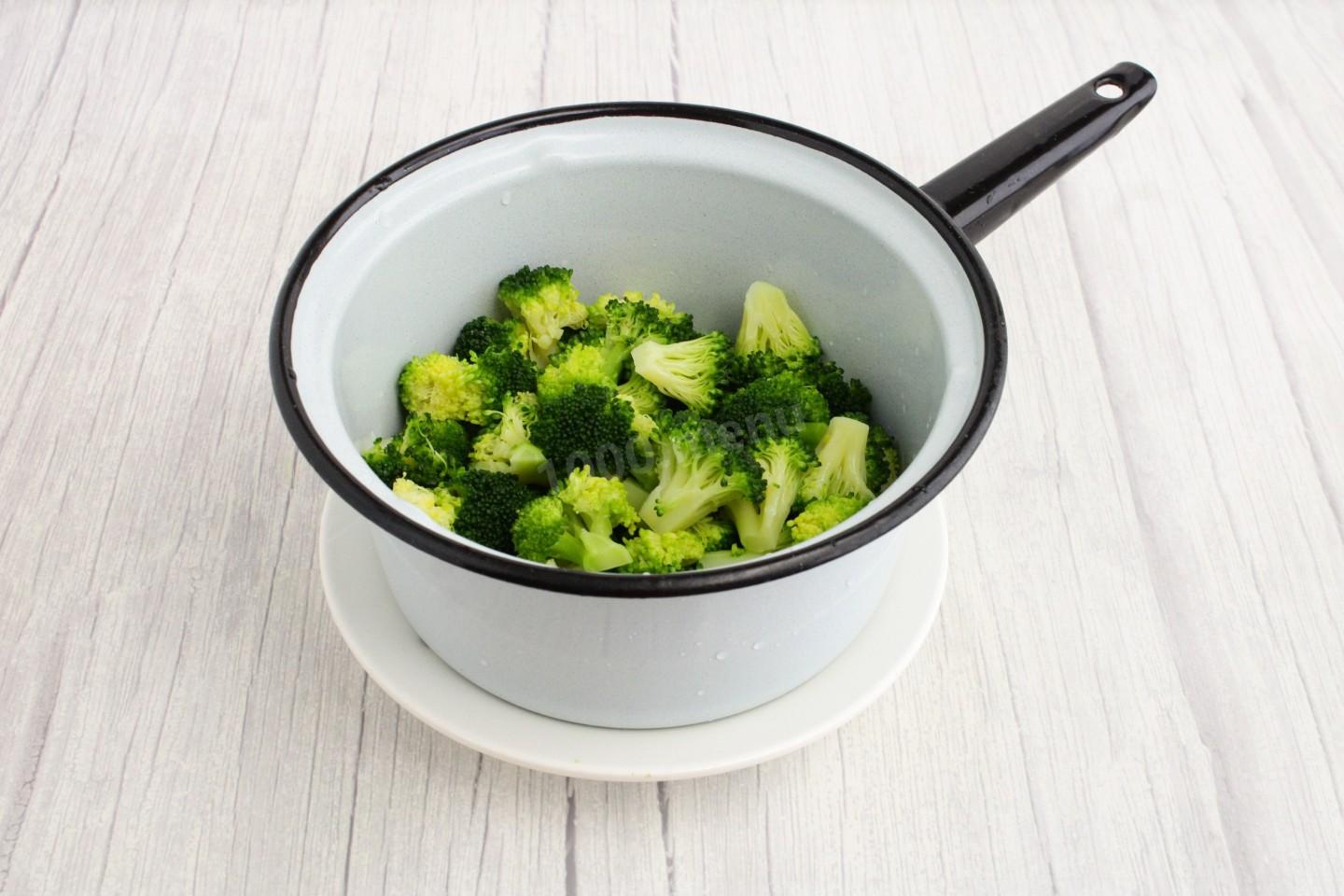 Помойте брокколи, срежьте толстые и жесткие стебли, разберите на соцветия. Опустите брокколи в кипящую воду и бланшируйте 3-4 минуты. Кипяток слейте и сразу залейте капусту холодной водой. Это сохранит ее цвет. Когда капуста остынет, откиньте ее на дуршлаг или сито, чтобы стекла вода. Можно ли использовать замороженную брокколи вместо свежей? Да, но её не нужно размораживать и бланшировать — достаточно добавить на сковороду за 3–4 минуты до готовности.