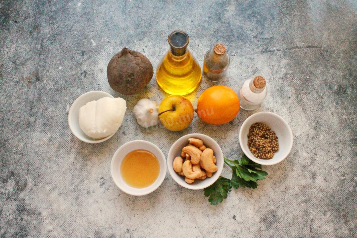 Подготовьте все необходимые ингредиенты. Яблоко и свеклу тщательно вымойте. Чеснок очистите, ополосните вместе с зеленью и обсушите бумажным полотенцем. Орехи (у меня кешью) прокалите немного на сухой сковороде на среднем огне примерно 2-3 минуты. Это позволит орехам раскрыть свой аромат и усилить вкус. Орехи можно взять любые, отлично подойдут грецкие.