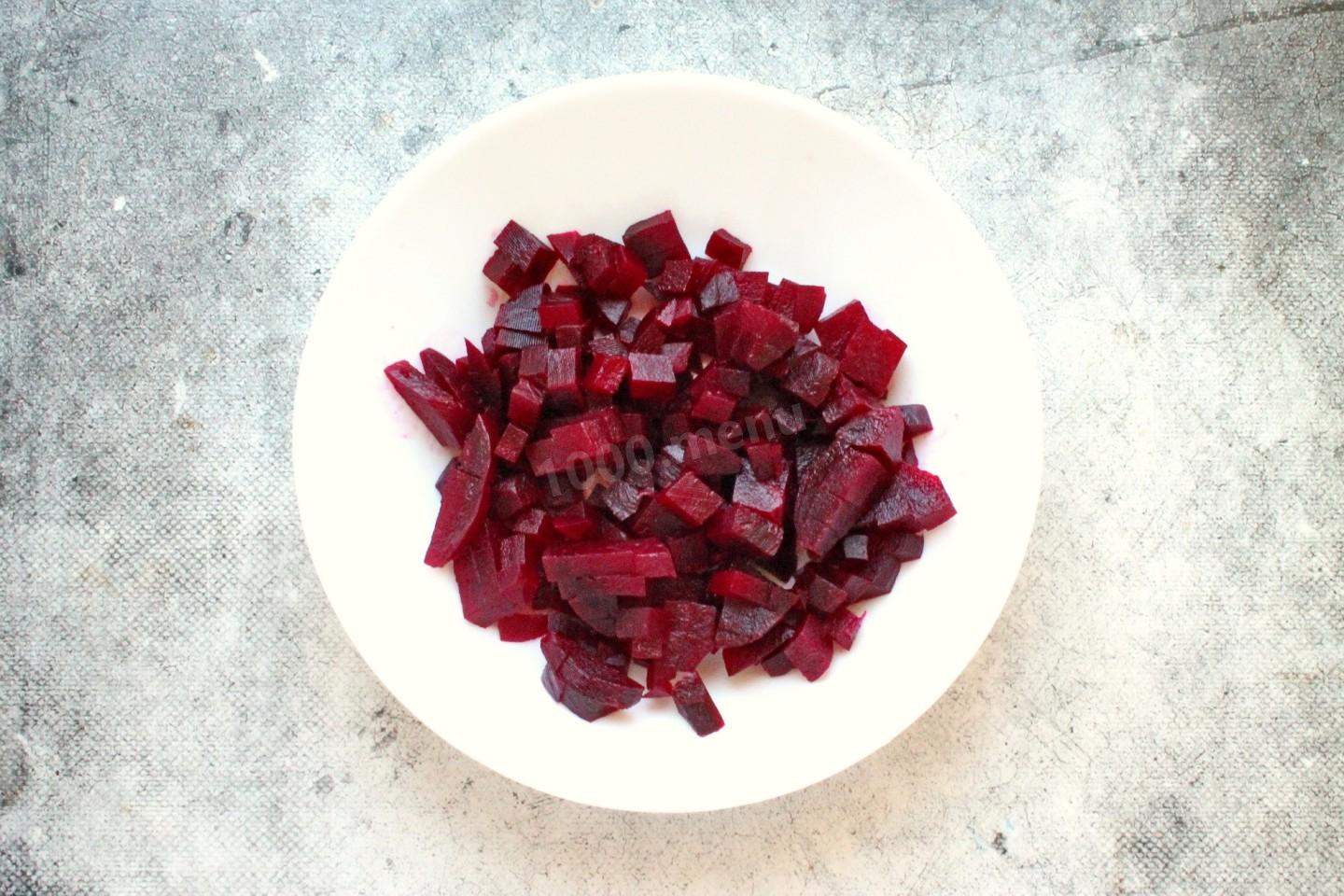 Свеклу отварите на среднем огне в течение 40-60 минут до готовности или запеките в духовке, завернув в фольгу. Отварную свеклу, остудите, очистите, порежьте средним кубиком и переложите в салатник.