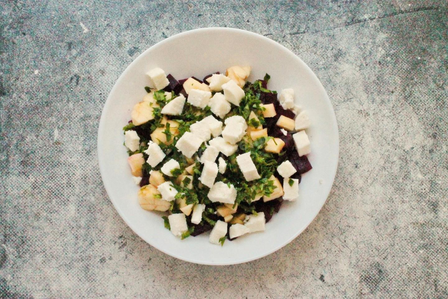 Зелень мелко порубите и добавьте в салатник. Брынзу порежьте кубиком или раскрошите и положите к свекле с яблоком. Брынзу можно заменить на другой вид сыра по вкусу.