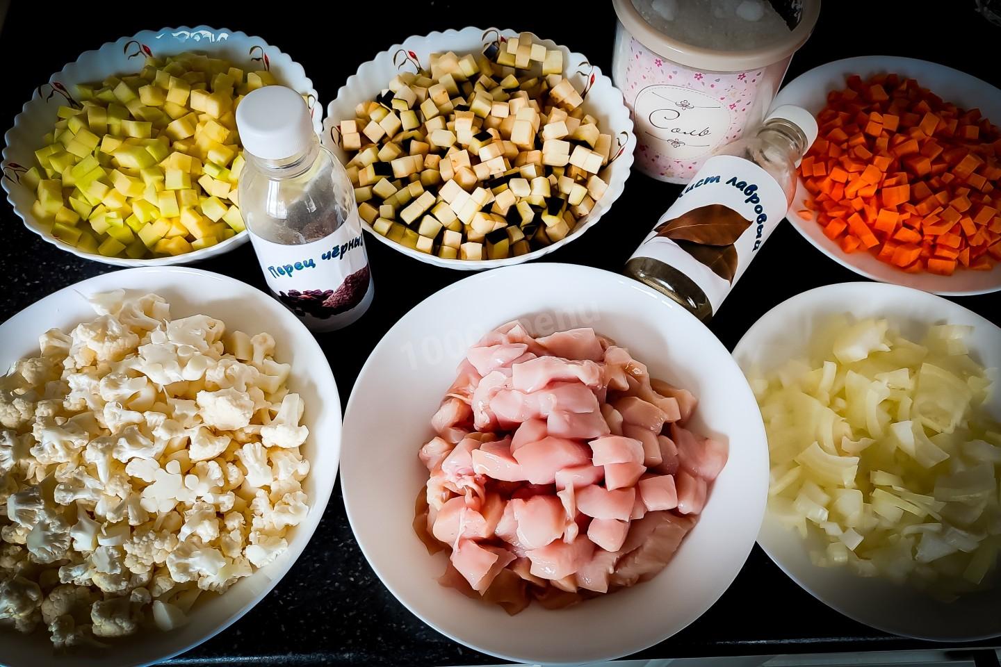 Помытые и очищенные овощи необходимо нарезать кубиками примерно по сантиметру на сторону. Мясо цыплёнка тоже нарезать на маленькие кусочки. Чтоб у мяса был более яркий вкус, то его можно пару часов подержать в соевом соусе. Лавровый лист и чёрный перец измельчить практически в порошок.