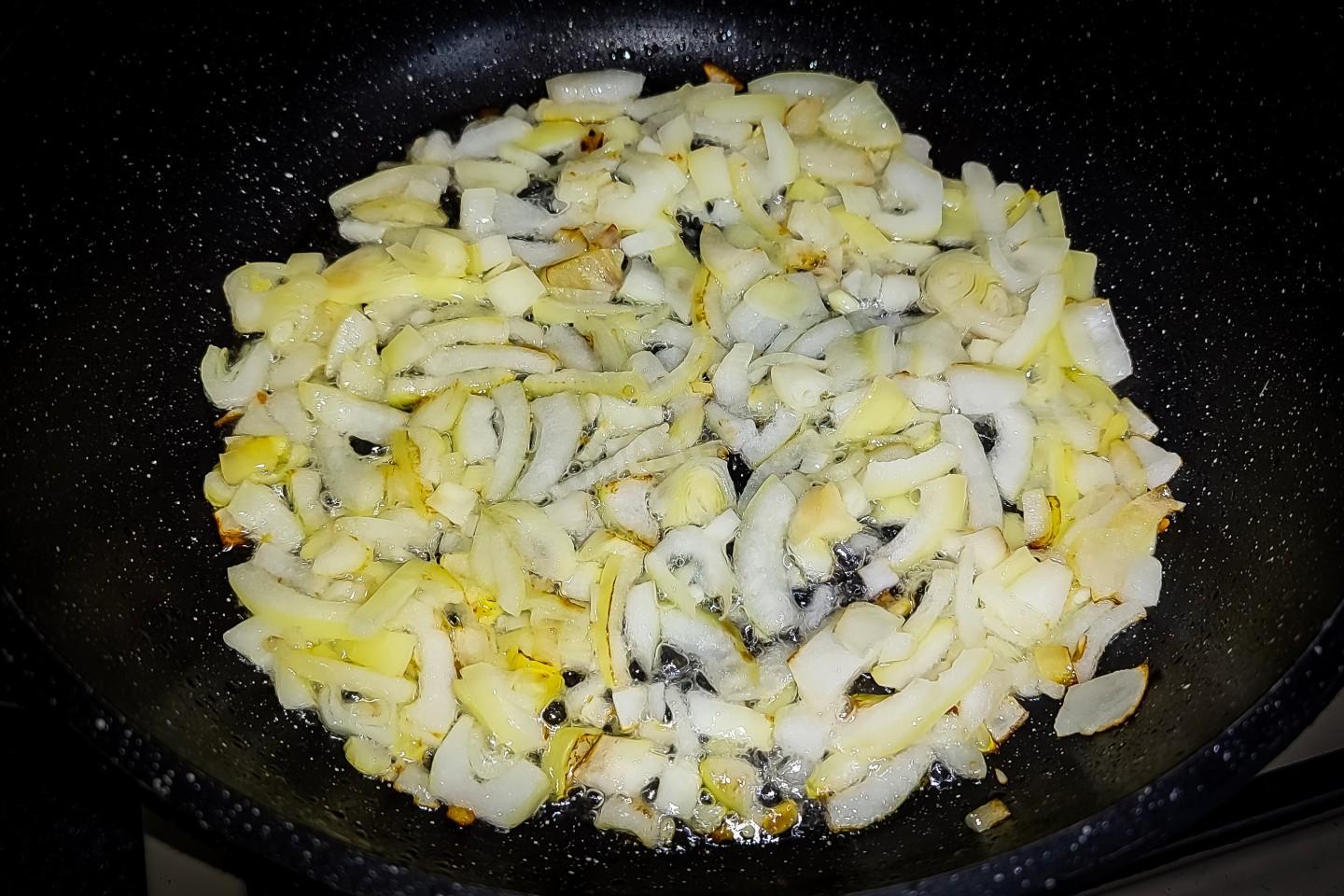 В предварительно хорошо прогретую сковороду влить растительное масло, масло раскалить и всыпать в него измельчённый лук. Огонь сделать на всю. Обжаривать лук, постоянно перемешивая, до начало образования золотистого цвета, зажаривать не нужно.