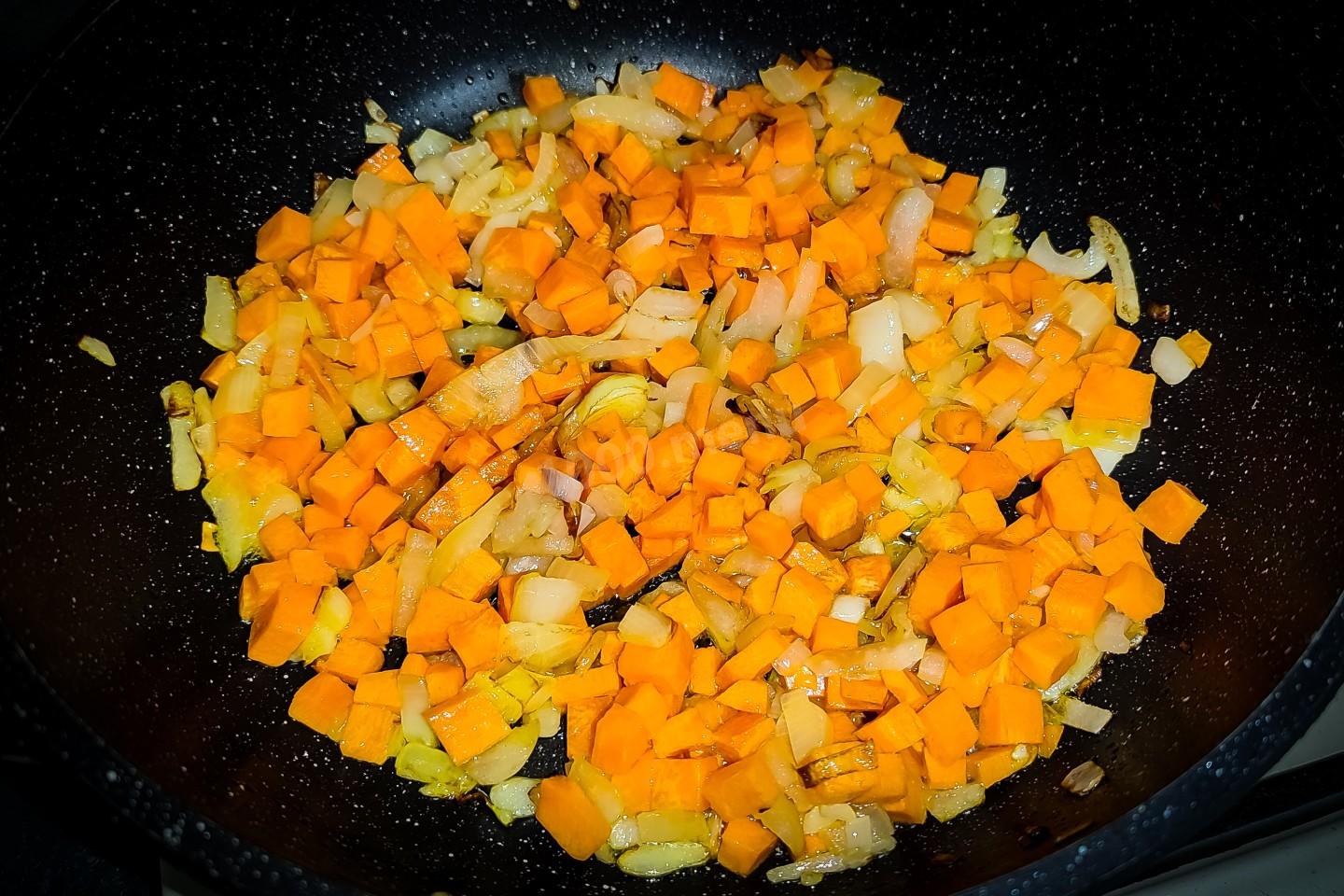 К луку всыпать морковь. Обжаривать при постоянном перемешивании минут пять. Морковь за это время немного смягчится.