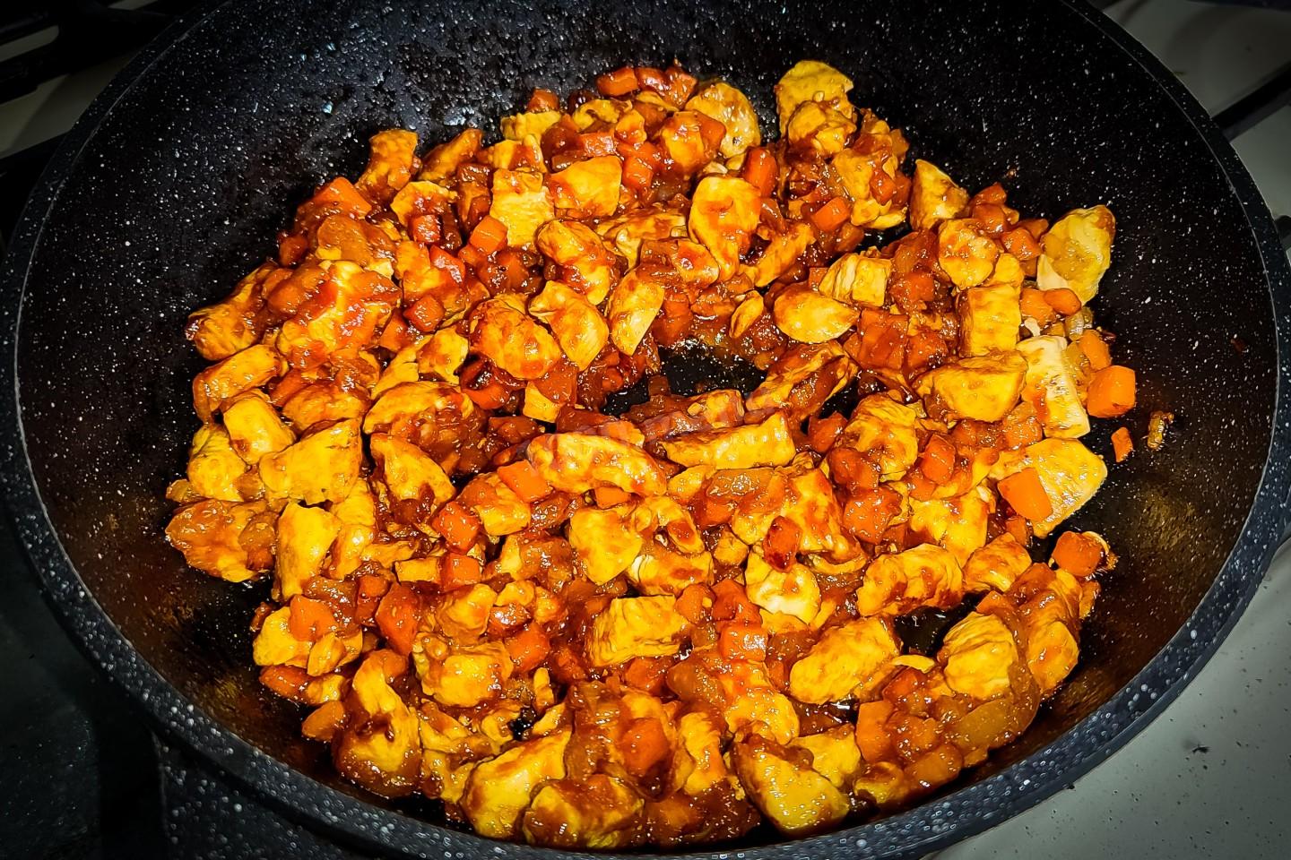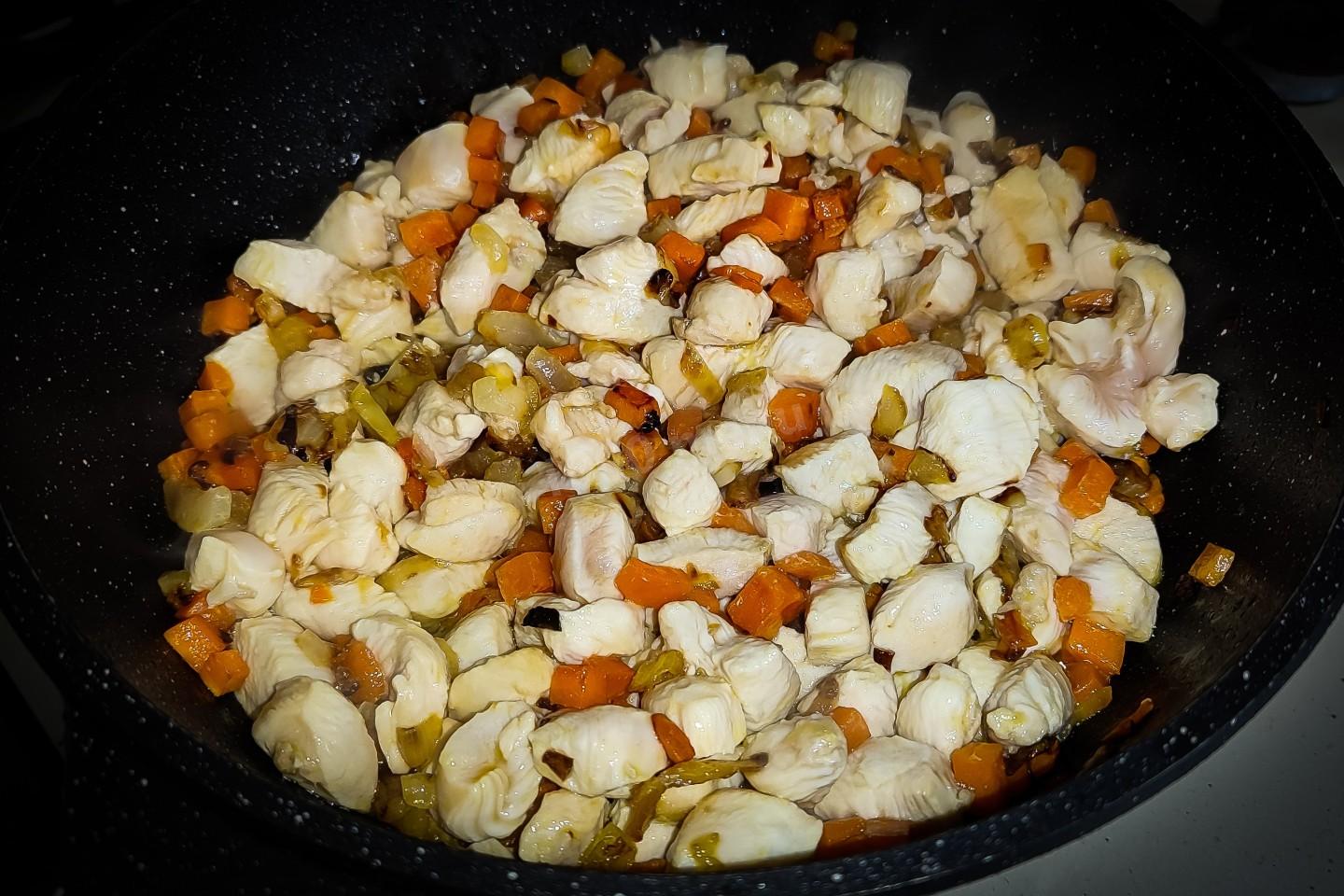 Всыпать в сковороду кусочки куриной грудки и всё также на сильном огне обжаривать, пока жидкость выделяемая мясом не нажнёт выпаривать. Зажаривать мясо не нужно. На это уйдёт примерно десять минут.