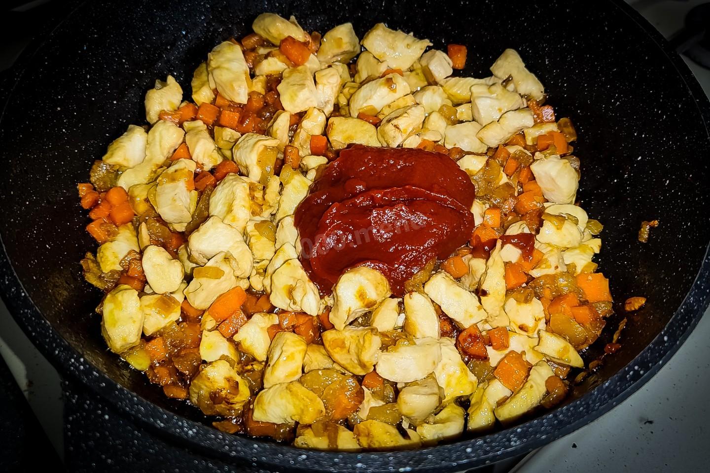 Теперь в сковороду добавить томатную пасту. Можно добавить вместо пасты томатный сок в количестве 200 мл.