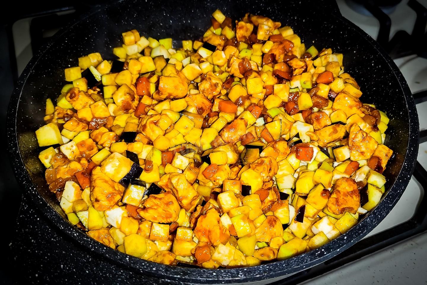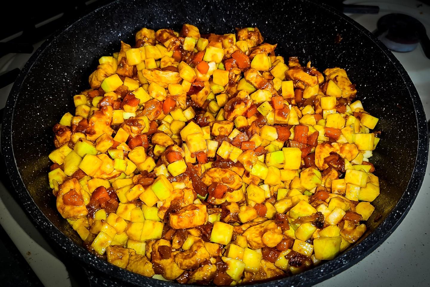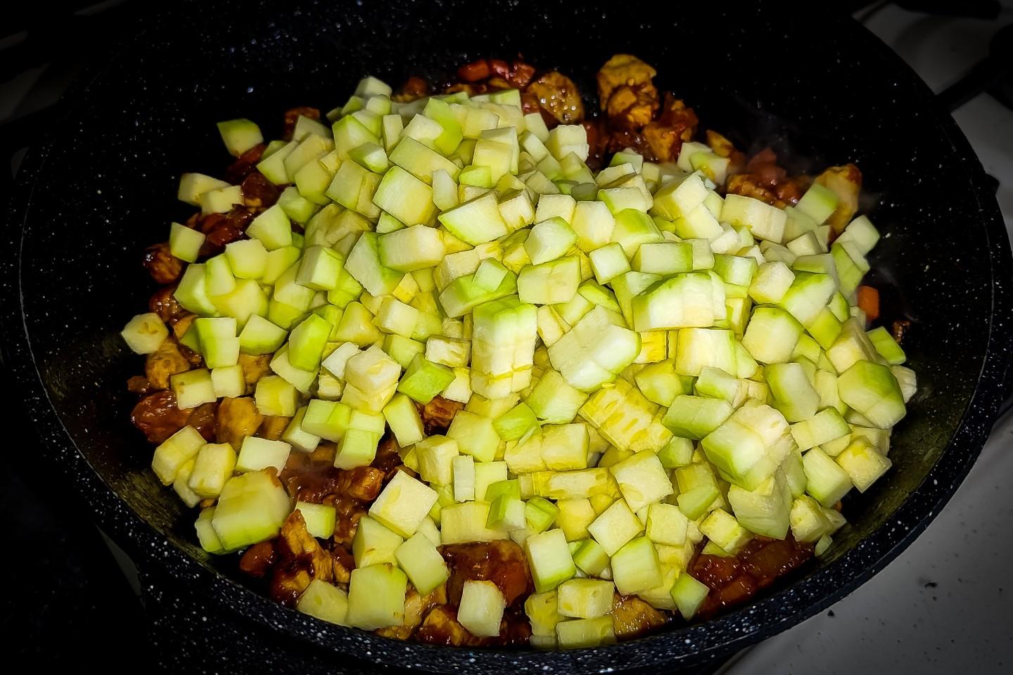 Теперь в сковороду добавить нарезанный кубиками кабачок. и постоянно перемешивая, обжарить минут пять.