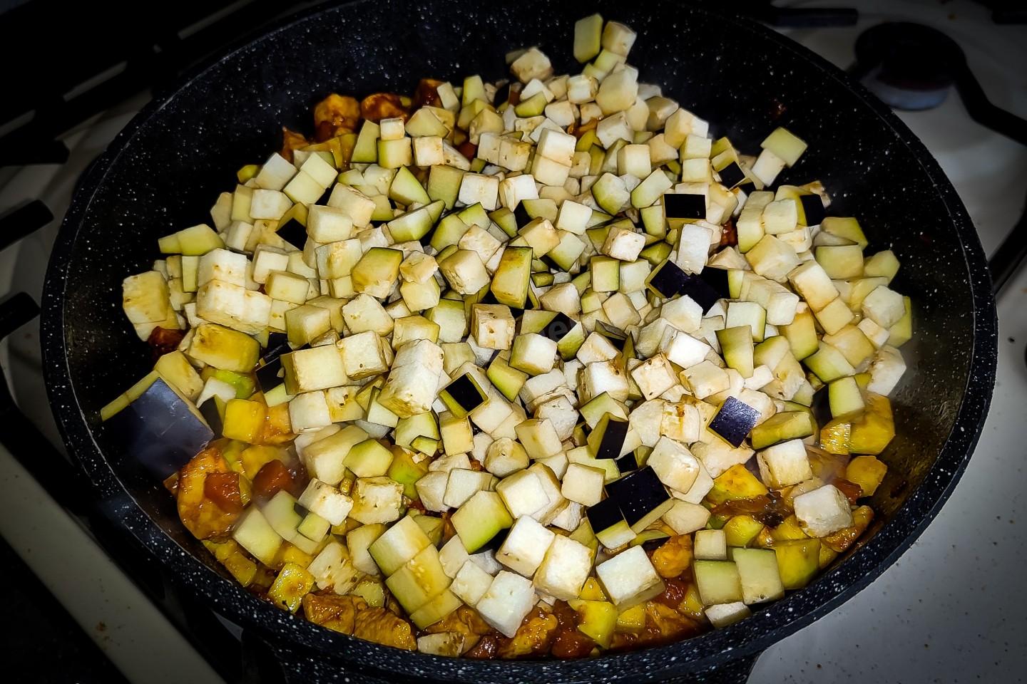 Всыпать в сковороду баклажан.