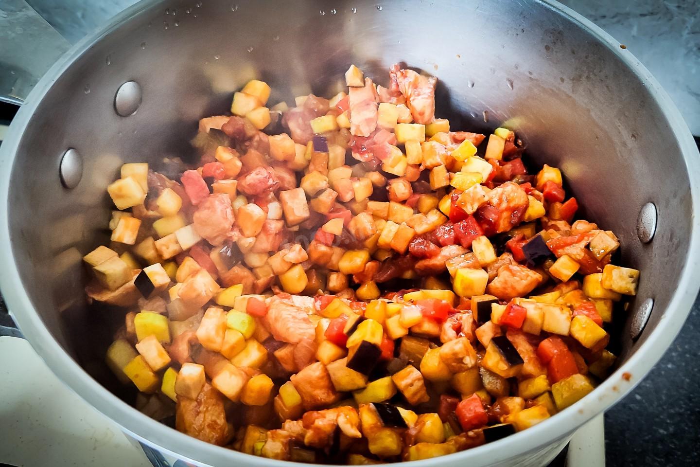 Теперь всё содержимое сковороды переложить в кастрюлю с толстым дном, огонь выставить на пинимум.