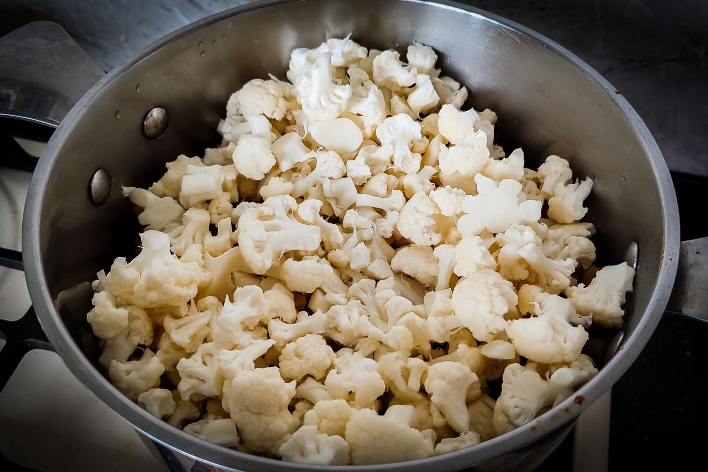 В кастрюлю добавить цветную капусту, которую предварительно измельчить по соцветиям. Так же посолить по вкусу, добавить по вкусу перец и лавр.