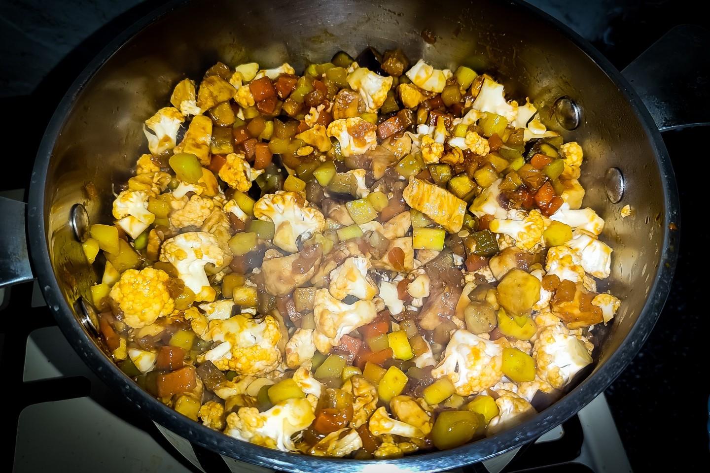 Убавить огонь на половину и всё содержимое обжаривать ещё пять минут.