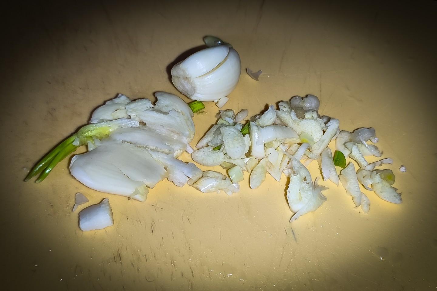 Пока всё томится, нарежем чеснок. Для этого чеснок предварительно раздавить ножом на разделочной доске, а потом уже мелко порезать.
