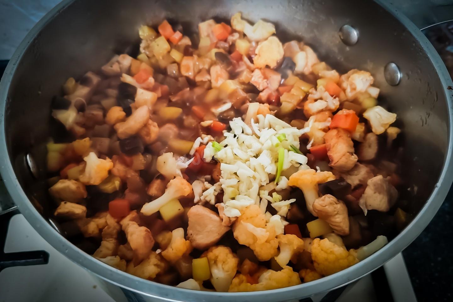 За пять минут до конца приготовления, чеснок выложить в кастрюлю и снова всё хорошо перемешать.