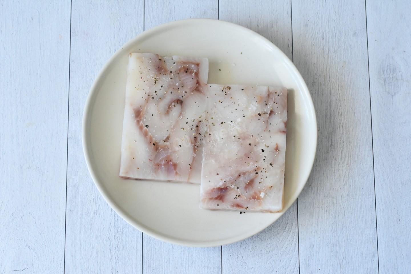 Филе минтая посолите и поперчите. Я использую готовое спрессованное филе минтая в брикетах. Можете самостоятельно разделать рыбу на филе.