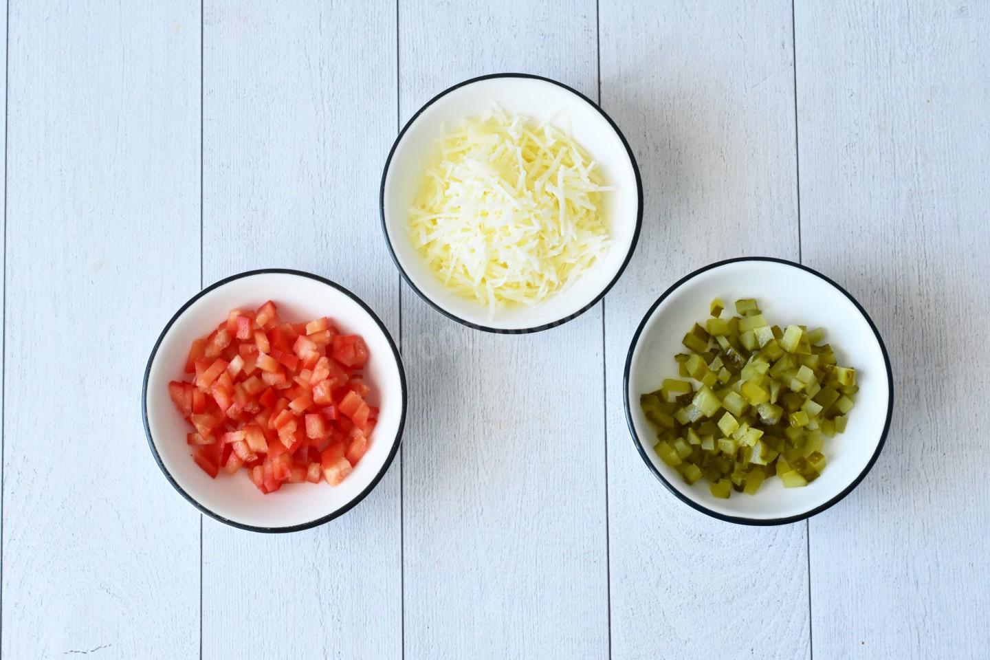Маринованные огурцы отряхните от рассола и нарежьте мелкими кубиками. Болгарский перец очистите от семян и плодоножки и нарежьте мелкими кубиками. Сыр натрите на мелкой терке.