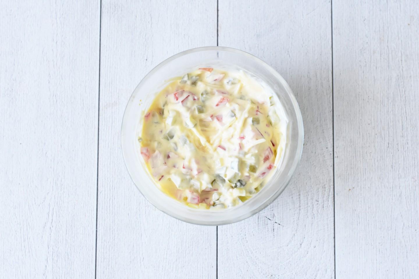 В миске соедините майонез, горчицу, огурцы, болгарский перец и большую часть сыра и перемешайте.