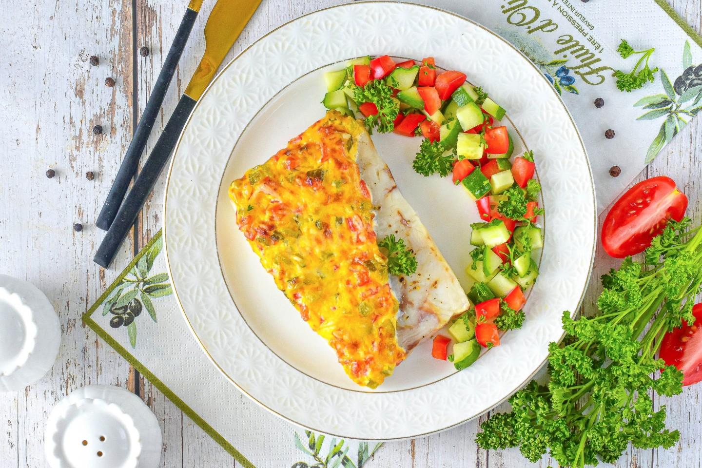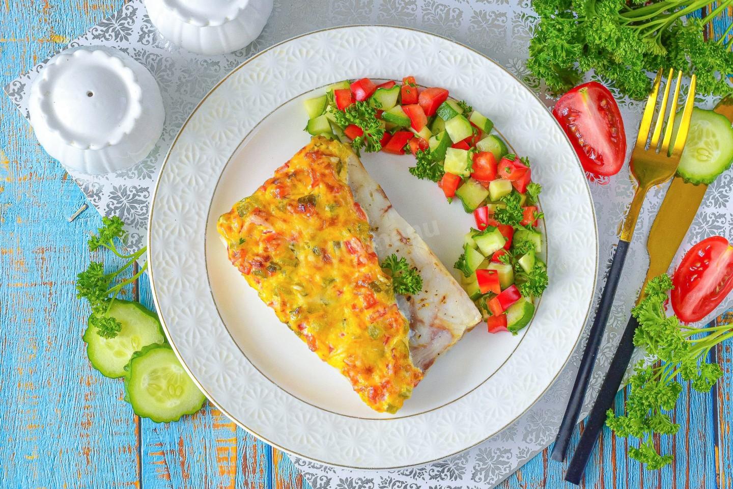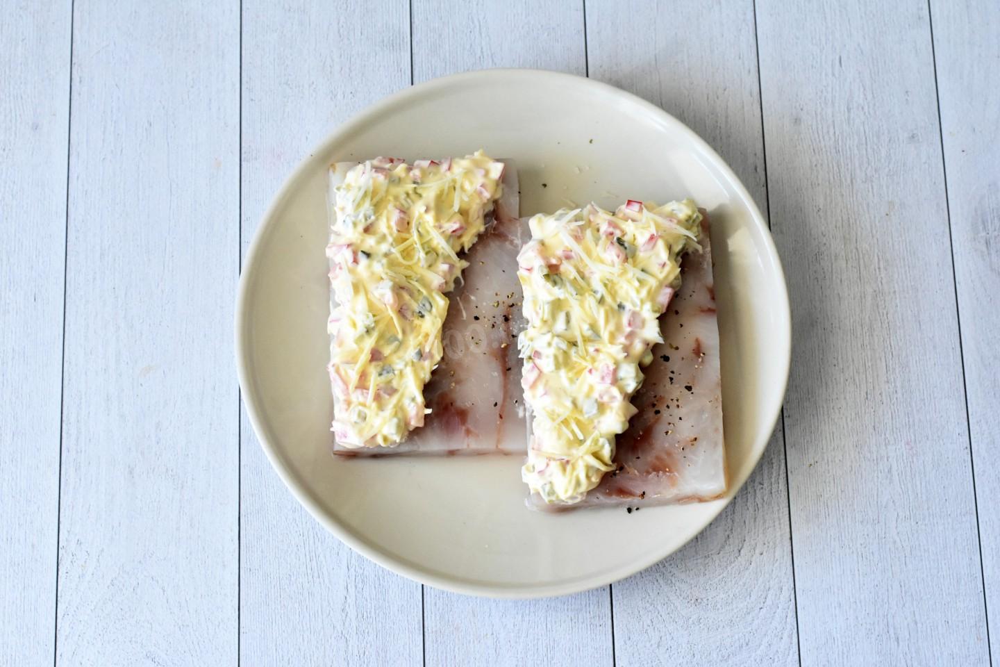 На половину каждого филе по диагонали выложите майонезно-овощную массу. По желанию можете распределить массу по всей поверхности филе. Поверх соуса распределите оставшийся тертый сыр.