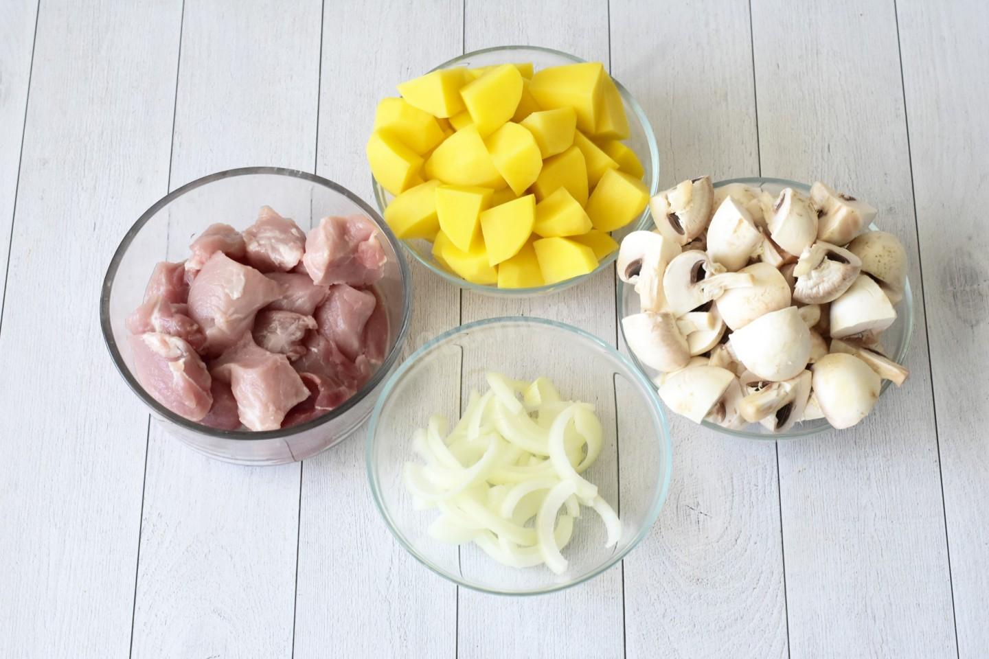 Свинину вымойте, обсушите и нарежьте крупными кусочками. Картошку вымойте, обсушите, очистите от кожуры и нарежьте средними кусочками. Грибы вымойте, обсушите. Крупные шампиньоны нарежьте четвертинками, мелкие оставьте целиком. Лук очистите, ополосните и нарежьте полукольцами.