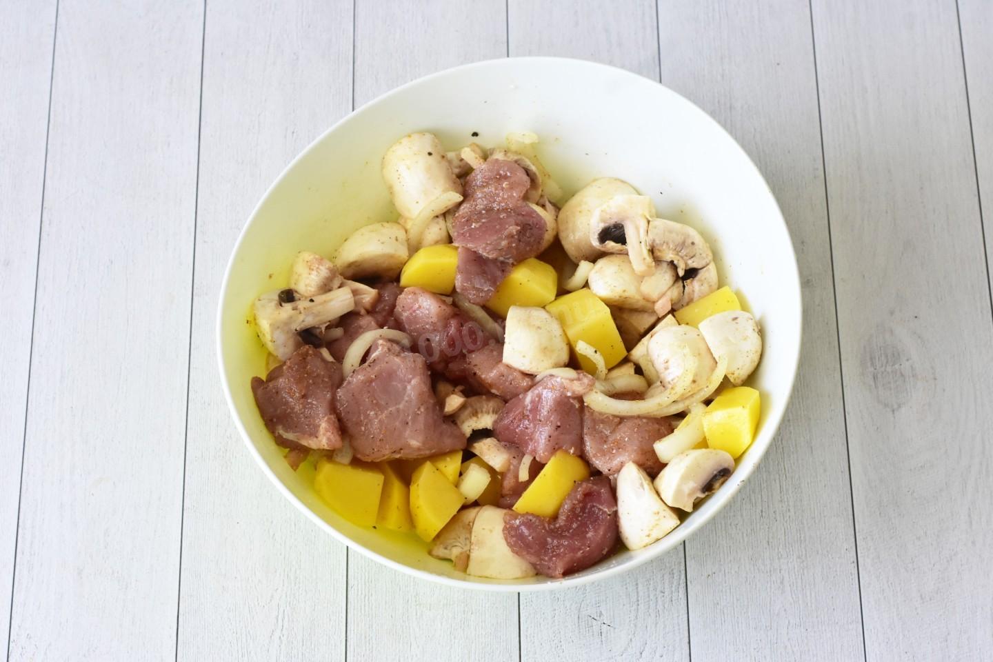 В большую миску выложите нарезанное мясо, картофель, грибы и лук; влейте растительное масло, всыпьте специи для мяса, соль и чёрный молотый перец по вкусу; тщательно перемешайте руками или лопаткой, чтобы каждый кусочек покрылся маринадом равномерно.
