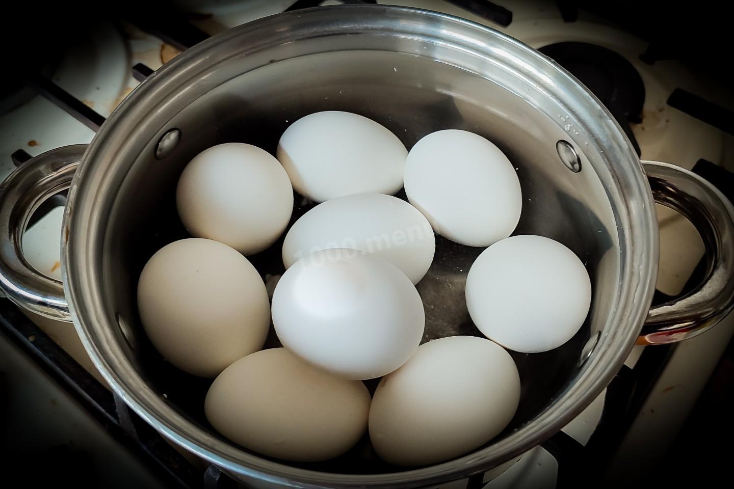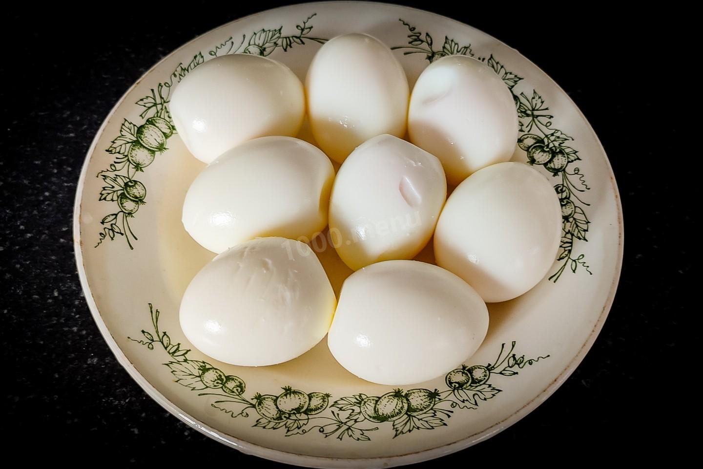 Отварить 9 яиц вкрутую. Для этого вскипятить воду, выложить яйца и после повторного закипания варить их 10 минут. Через 10 минут слить кипяток и залить ледяную воду. От такого контраста температур яйца будут хорошо и легко чиститься.