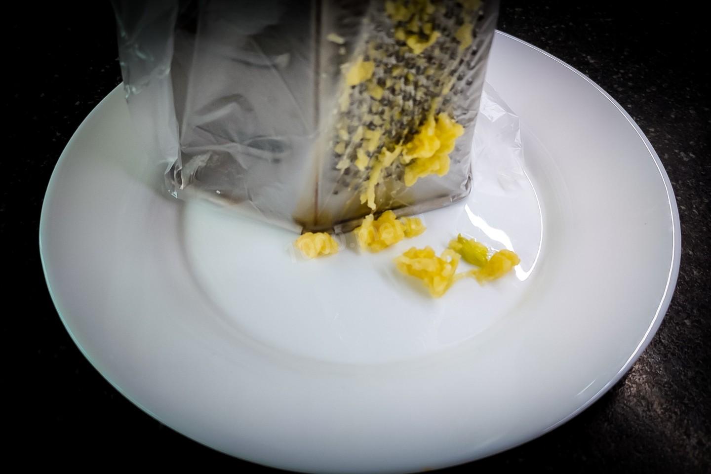 Пока остывает маринад приготовим остальные ингредиенты. Для этого на самой мелкой тёрке натереть зубчики чеснока. Чтоб потом не мучаться с чисткой тёрки, я на неё надеваю обыкновенный полиэтиленовый пакет. Потом с него просто снять натёртый чеснок.