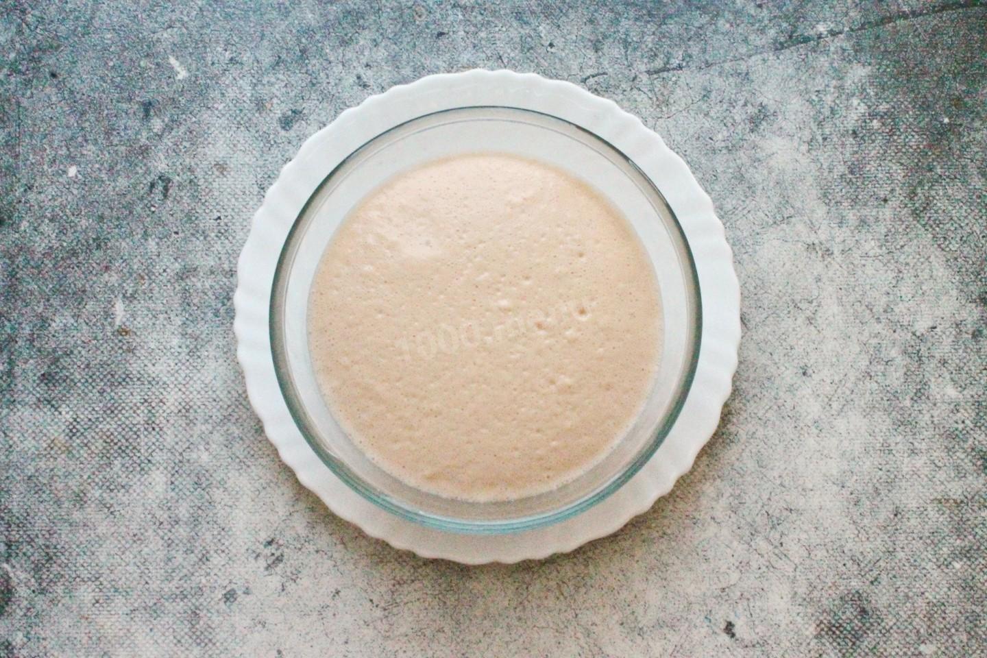 Для этого в небольшой миске подогрейте молоко примерно до 38-40 градусов, добавьте сахар и раскрошите дрожжи. Все хорошо перемешайте до растворения сахара и дрожжей. Всыпьте 50 грамм муки из общего веса и перемешайте до однородности. Накройте миску пищевой пленкой и уберите опару в теплое место на 20-30 минут для начала работы дрожжей.