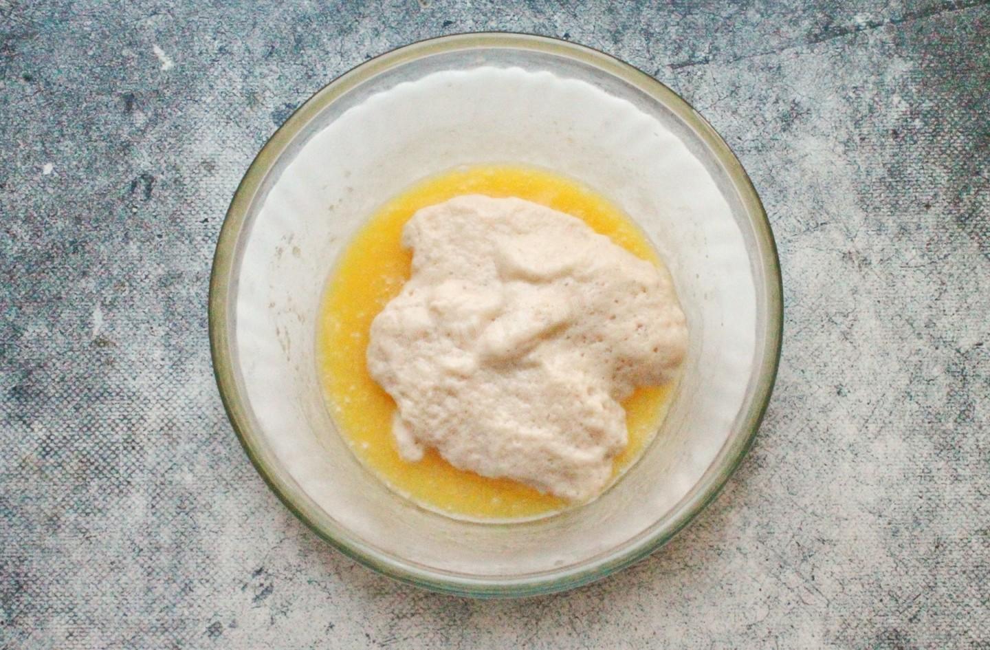 Сливочное масло растопите любым удобным способом и остудите. Как правильно растопить масло читайте в конце рецепта. Вбейте к маслу яйца и перемешайте венчиком. Добавьте в массу готовую опару и снова всё хорошо перемешайте.