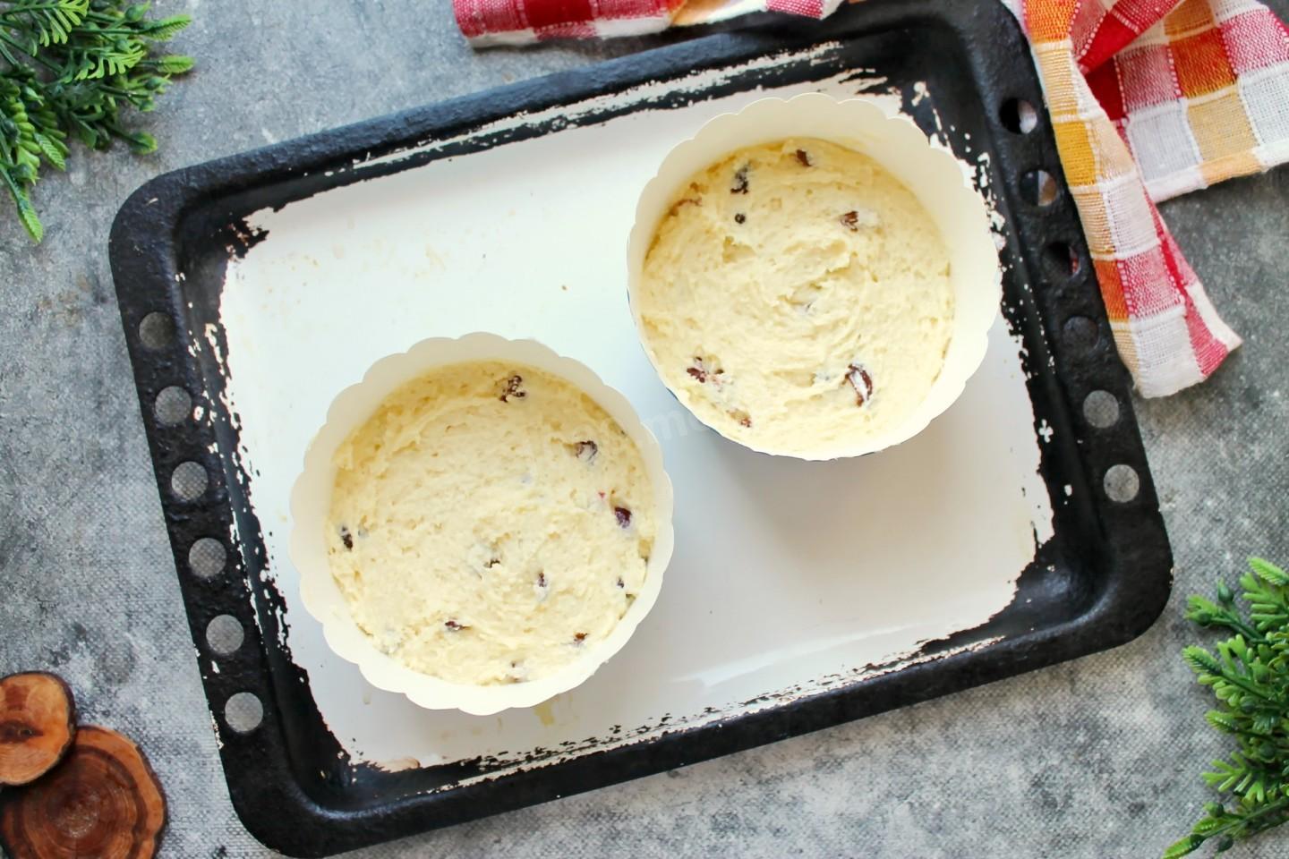 Миску с тестом накройте пленкой и уберите в теплое место на 1-1.5 часа для подъема. Точное время будет зависеть от температуры в помещении и активности дрожжей. Подошедшее тесто разделите на части и уложите в формы для куличей, заполнив на 3/4 высоты. Поставьте формы с тестом на противень и накройте сверху чистым полотенцем. Поставьте в теплое место на 15-20 минут для расстойки. Включите духовку ня 180 градусов.