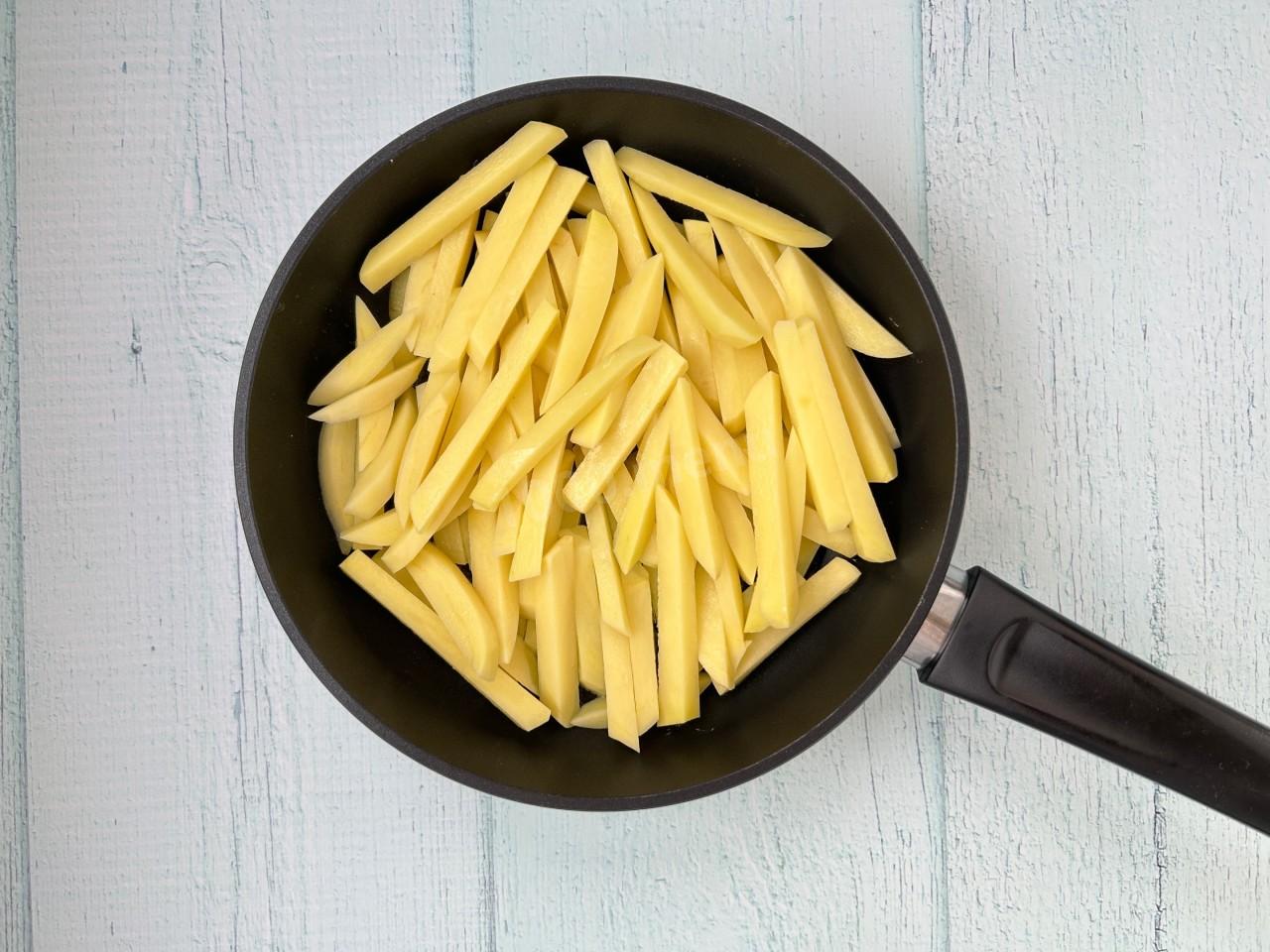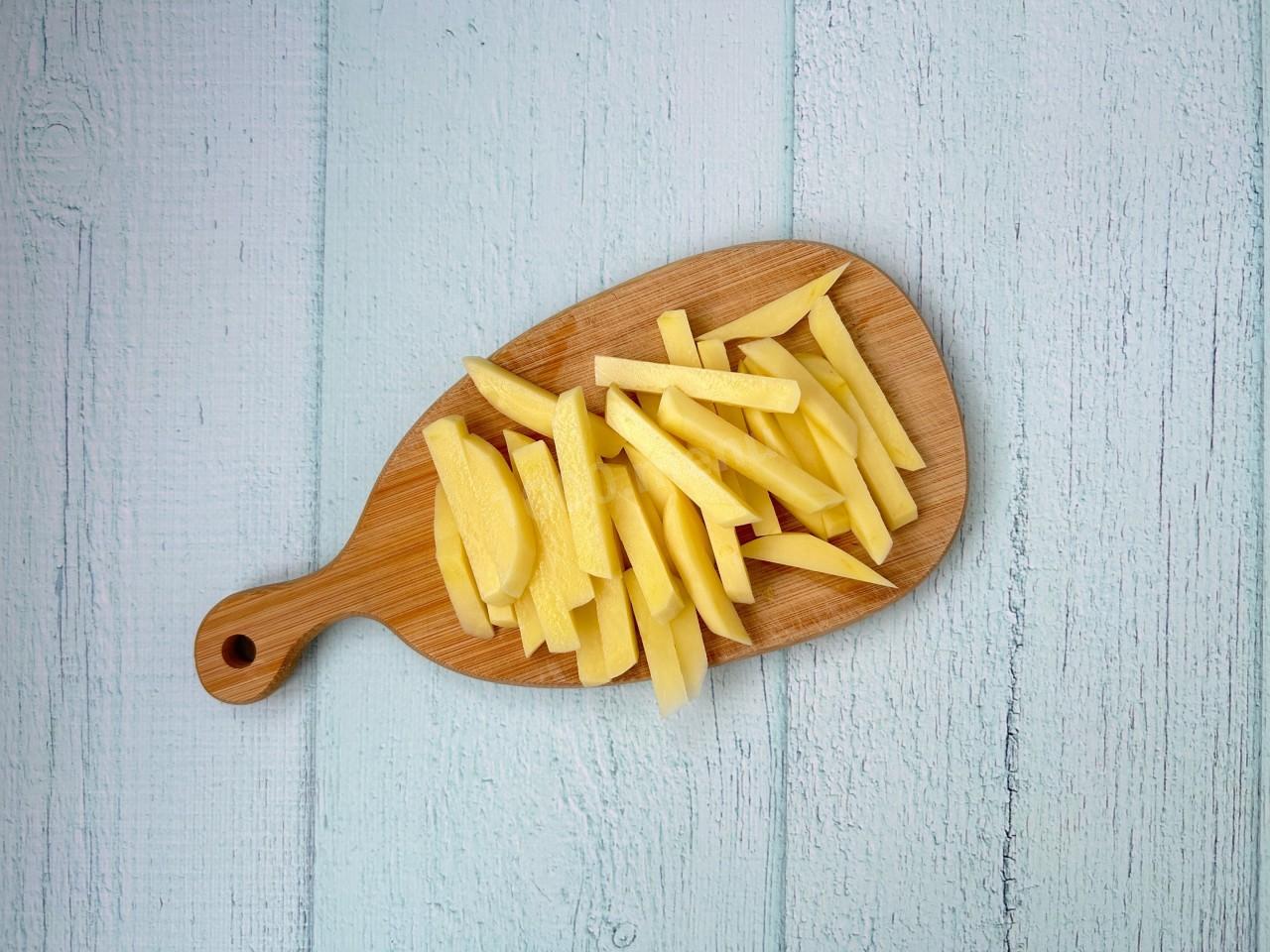 Очистите картофель, промойте и нарежьте соломкой. Промойте нарезанный картофель в холодной воде, чтобы удалить лишний крахмал, затем обсушите на бумажном полотенце.