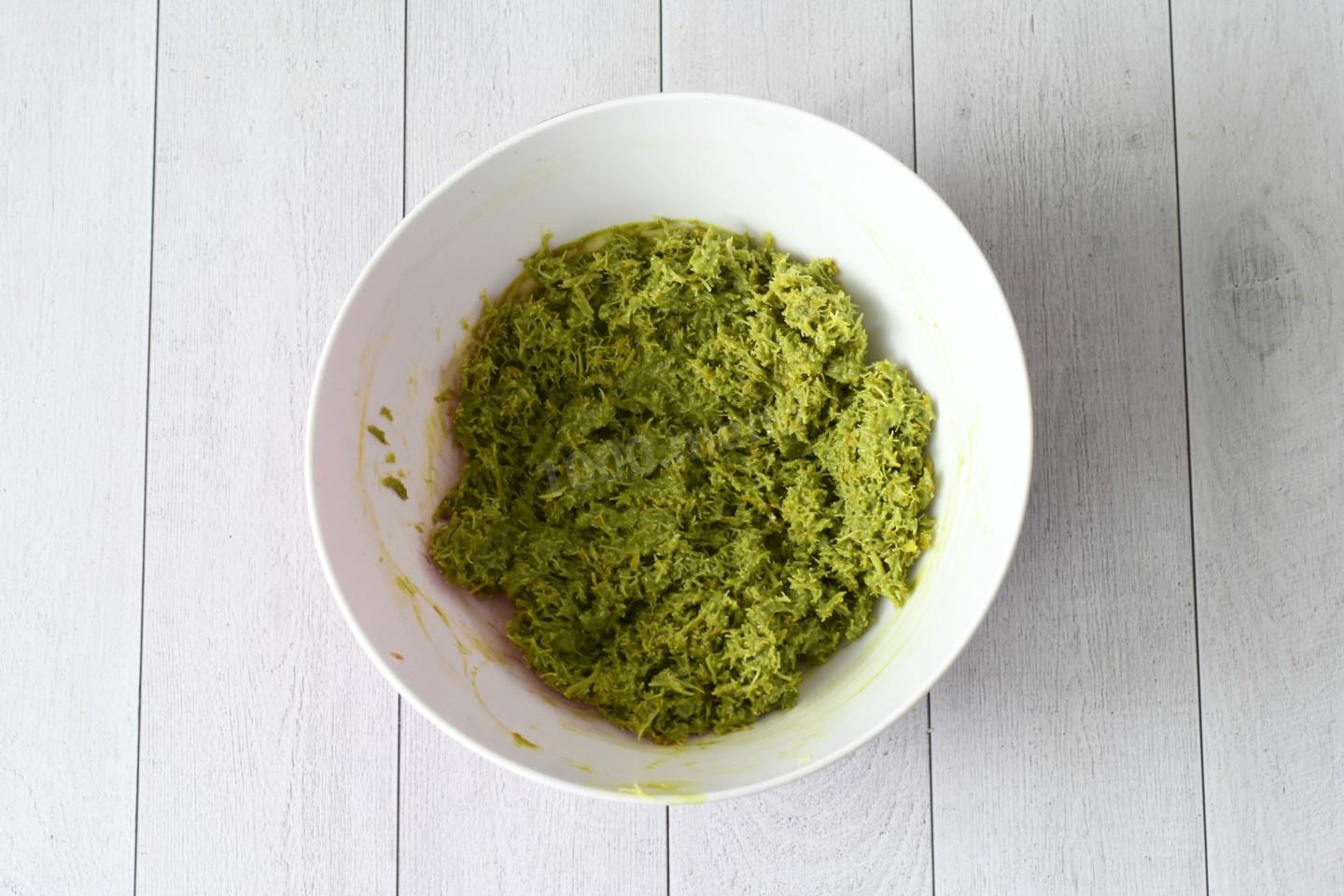 Переложите тесто в миску, добавьте тахини и фисташковую пасту и перемешайте. Если нет возможности купить тахини, можете сделать ее самостоятельно по этому рецепту. Еще один вариант - в 25 г кунжутной халвы добавить 1 ч. л. рафинированного подсолнечного масла, размять до однородности и протереть через сито.