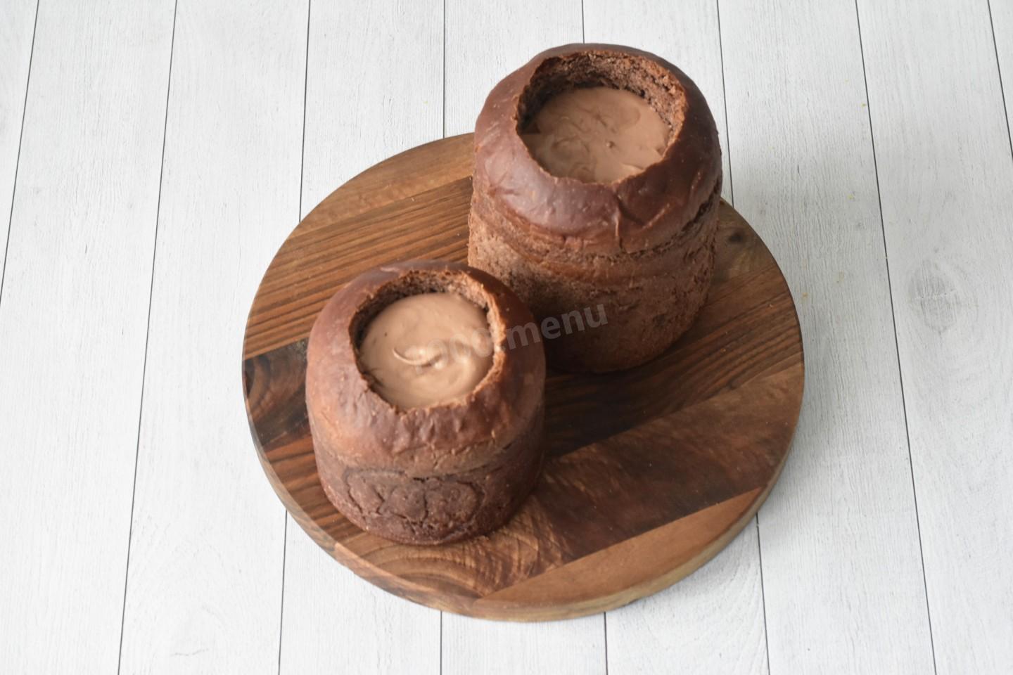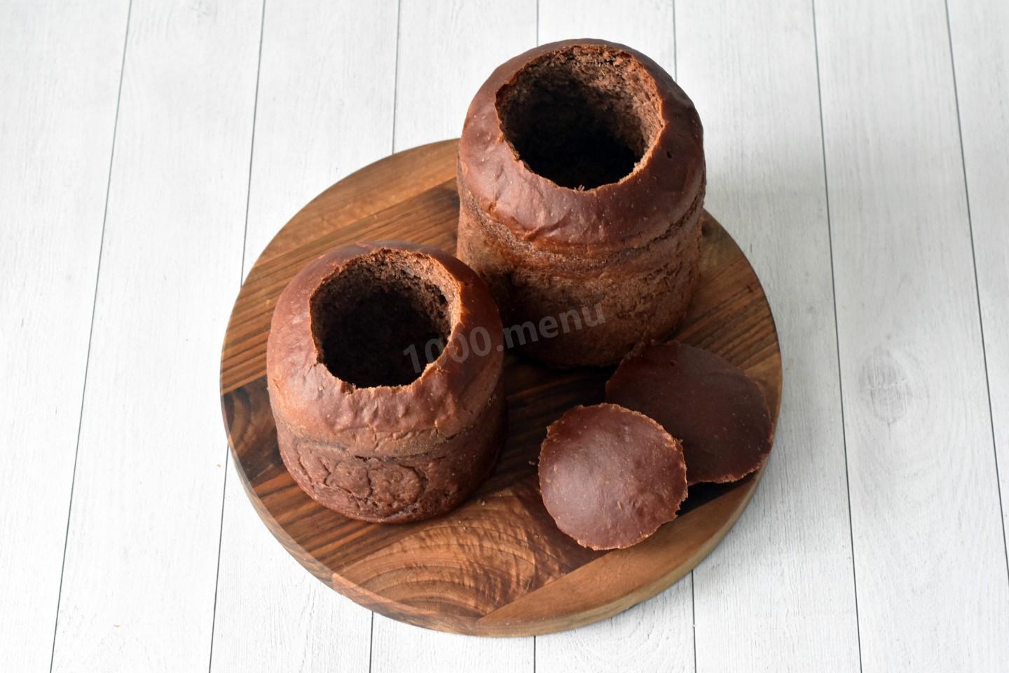 Готовые куличи охладите. Сделайте в куличах круглое отверстие при помощи ножа. Крышечку сохраните. Мякиш аккуратно выньте, оставляя стенки толщиной 1,5-2 см.
