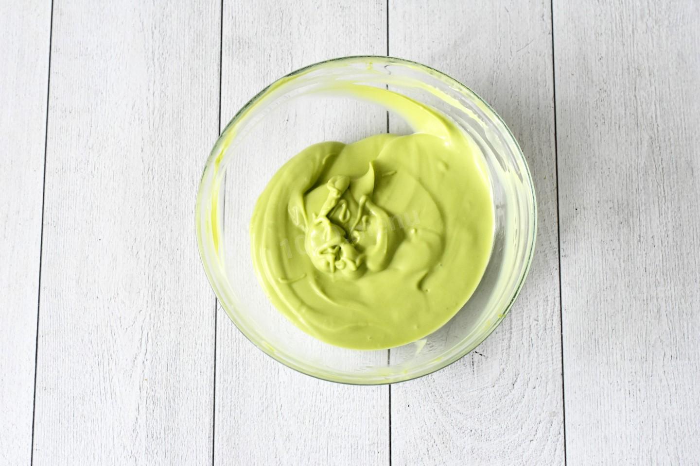 Белый шоколад смешайте с фисташковой пастой и, помешивая, растопите на водяной бане или в микроволновке. Глазурь слегка охладите.