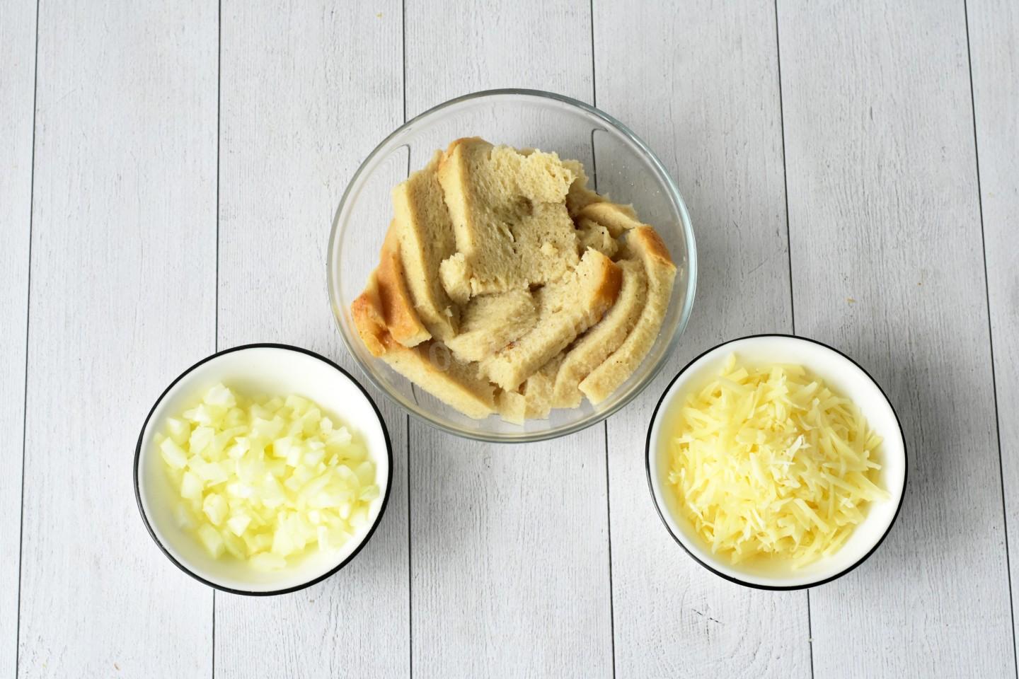 Шаг 3. Как подготовить хлеб, лук и сыр для фарша?