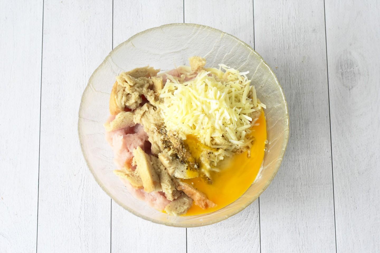 В миске соедините куриный фарш, замоченный хлеб, яйцо, луковицу, сыр, сливки, соль и перец. Все тщательно вымесите. Дайте фаршу настояться 10 минут.