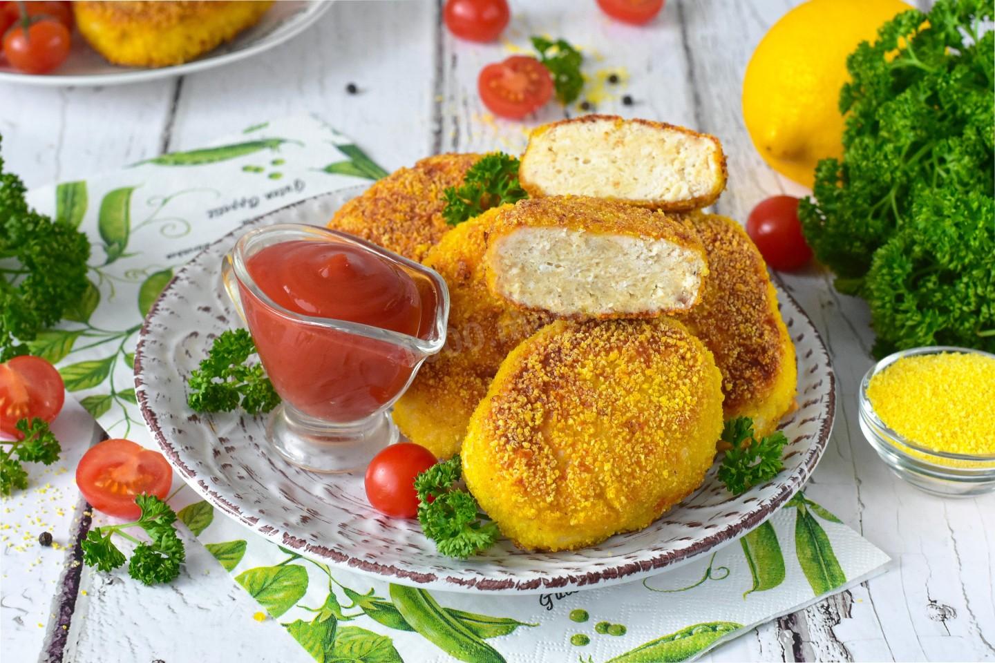 Куриные котлеты в панировке переложите на тарелку и подайте к столу с любым соусом и гарниром. Приятного аппетита!