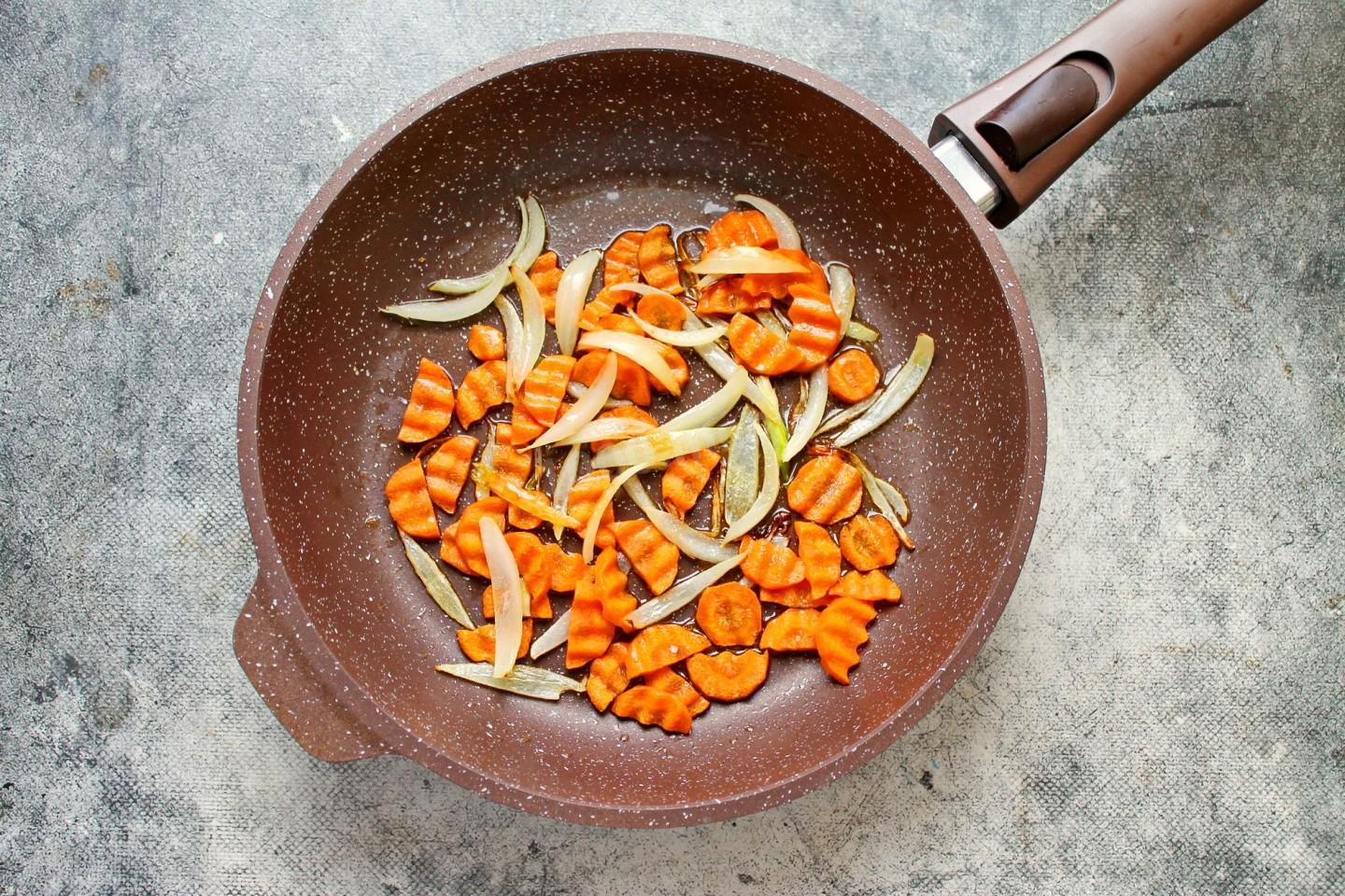 Морковь разрежьте вдоль пополам и нарежьте полукольцами, а репчатый лук перышками. Для нарезки моркови я использовала фигурный нож. В сковороду налейте растительное масло и разогрейте на среднем огне. Положите овощи и обжаривайте, перемешивая, в течение 3-4 минут.
