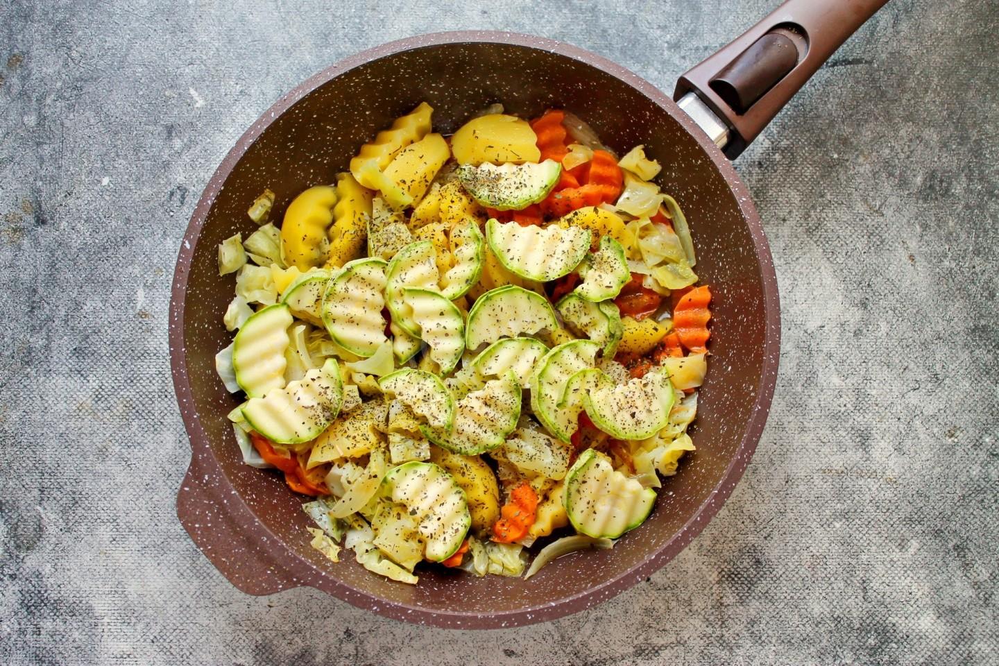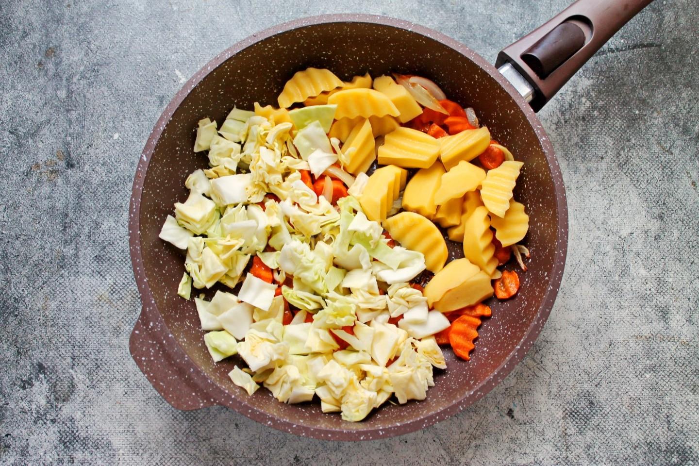 Картофель порежьте дольками и положите в сковороду. Капусту белокочанную порежьте средним кубиком и положите к овощам, перемешайте. Влейте горячую воду и готовьте еще 10 минут на медленном огне под крышкой.