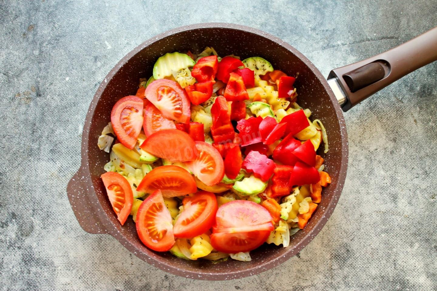 Болгарский перец порежьте крупной соломкой, помидоры дольками. Положите овощи в сковороду, все перемешайте и тушите еще 7-8 минут под крышкой на медленном огне.