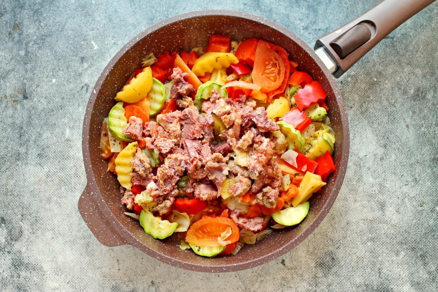 Шаг 6. Как правильно добавить к овощам тушенку?