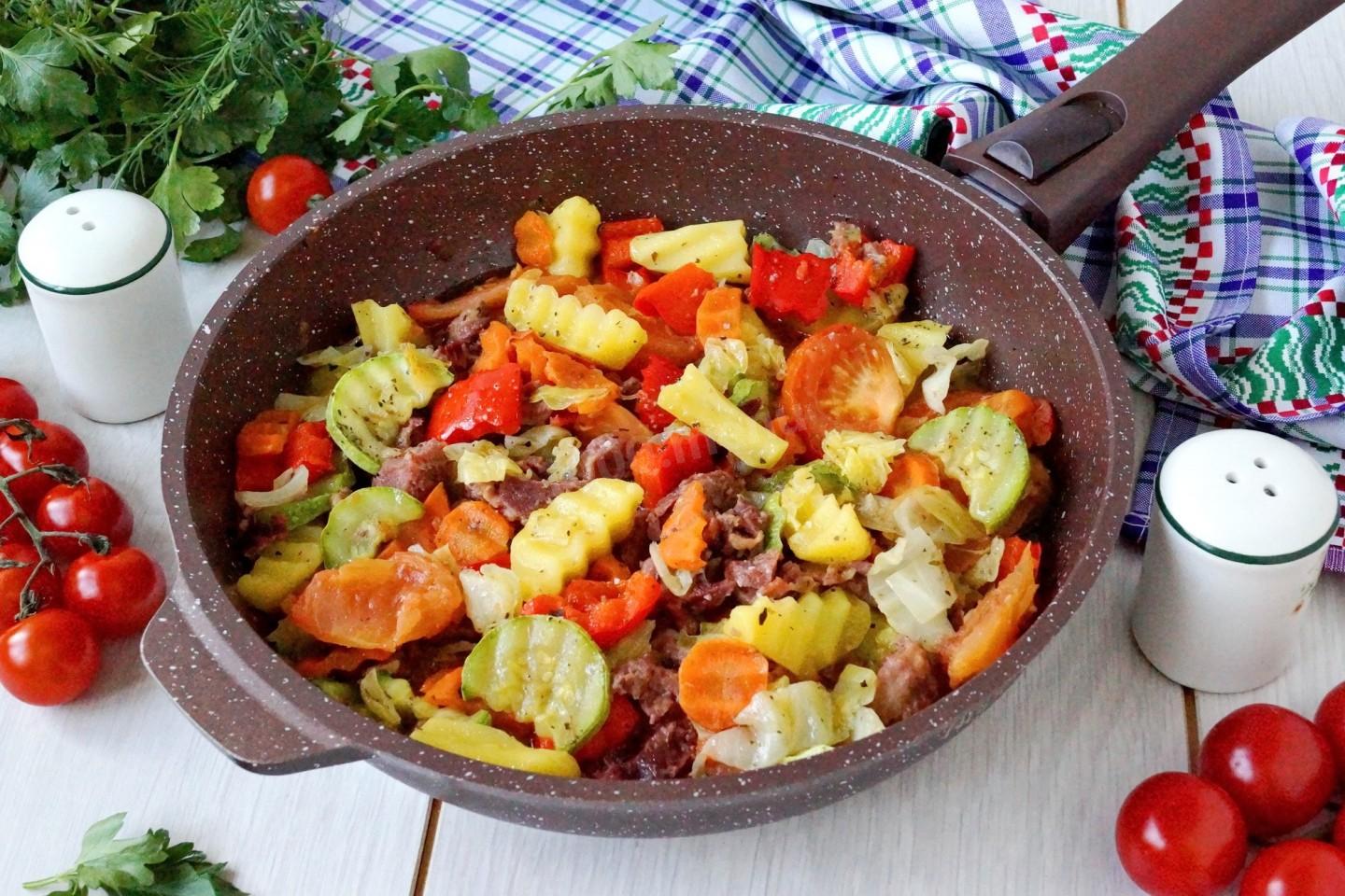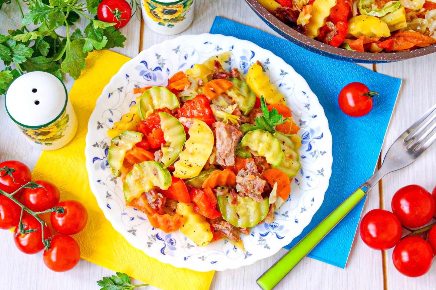 Рагу с тушенкой – это не только вкусно, но и питательно. Говяжья тушенка дает полноценный белок и железо. Овощи (кабачки, капуста, перец) – кладезь клетчатки и витамина С, который улучшает усвоение железа. Блюдо нормализует пищеварение и надолго утоляет голод.