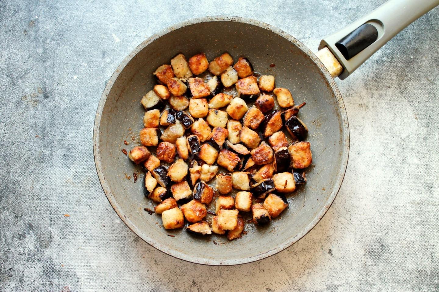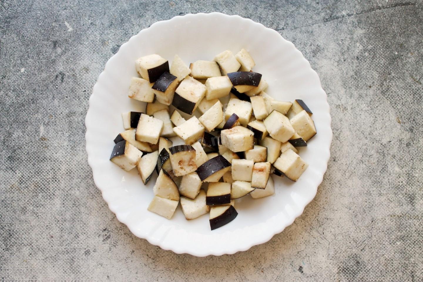 У баклажана отрежьте кончики и зеленую плодоножку. Порежьте баклажан средним кубиком. Как убрать горечь из баклажанов? Переложите нарезанный баклажан в миску и посолите. Все перемешайте и оставьте на 10 минут. Сполосните баклажаны, откиньте на сито и дайте воде полностью стечь. После этого обсушите овощ бумажным полотенцем.