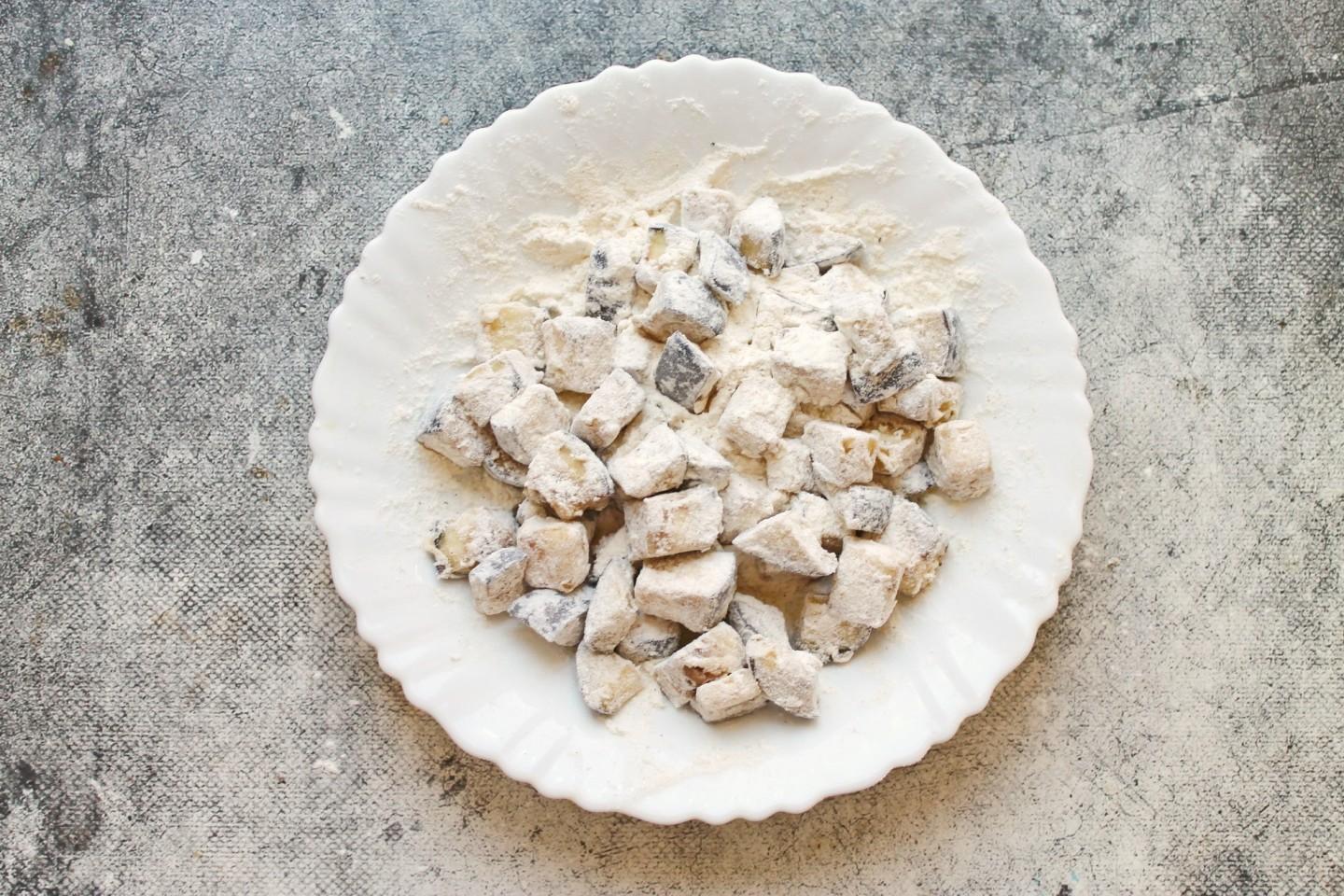 В миске смешайте муку, сухой чеснок, соль и черный перец. При желании можно добавить любимые специи, например молотый кориандр. Положите в мучную массу подготовленные баклажаны и перемешайте, чтобы кусочки полностью были покрыты.