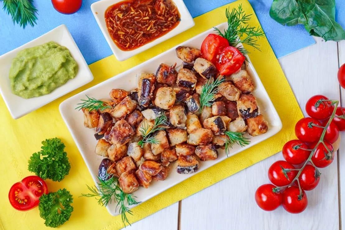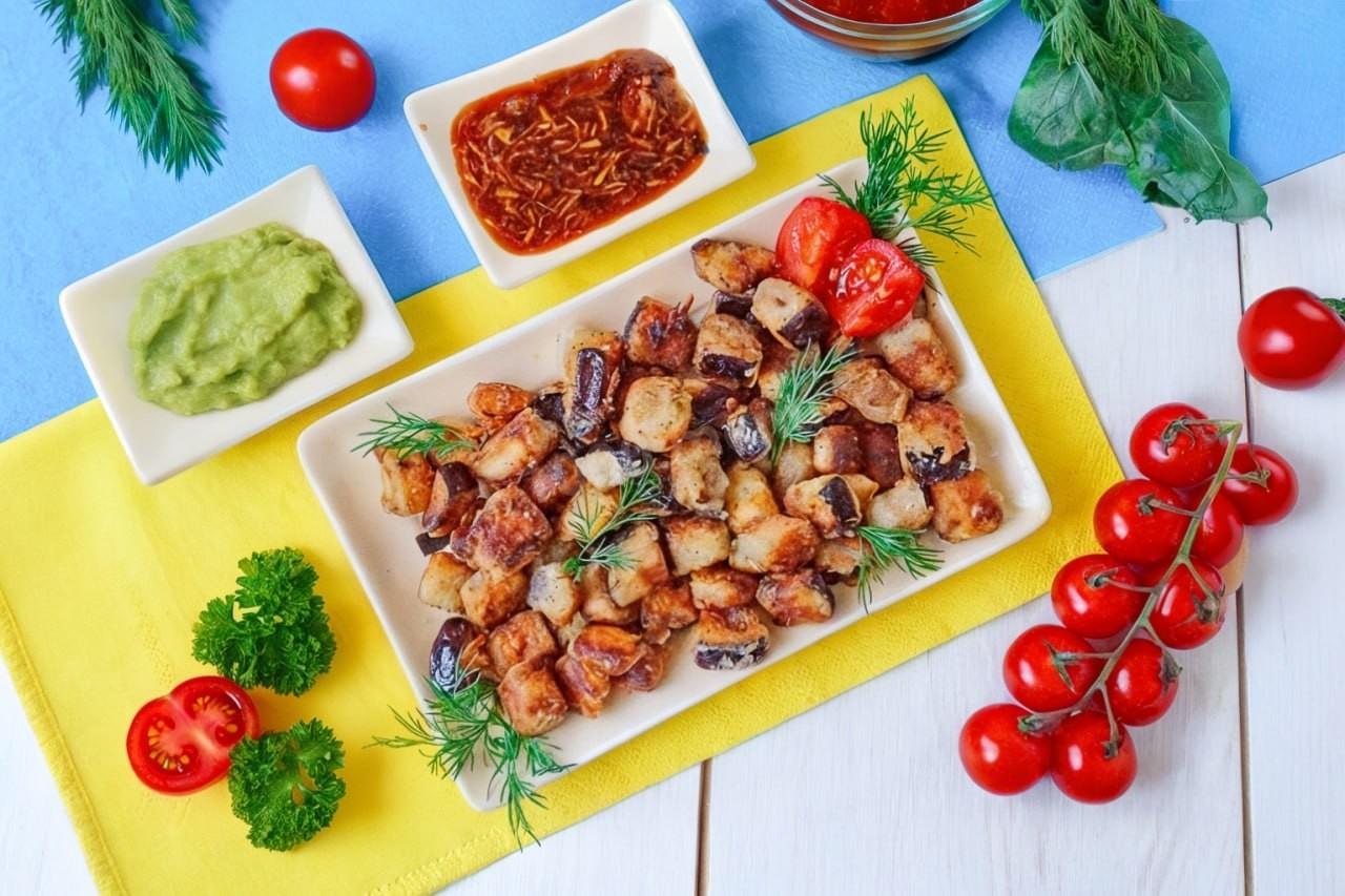 Баклажаны пришли в Европу из Азии, где их всегда панировали в рисовой или пшеничной муке для хруста. Соус терияки появился в Японии как «блестящий гриль». Соединение восточной панировки и сладкого соуса — современный фьюжн, который полюбили за быстроту. В Израиле похожие кубики подают с тахини, а здесь мы заменили его на терияки.
