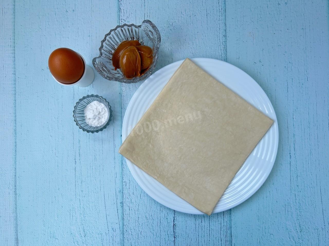 Очень просто. Для начала подготовьте все необходимые ингредиенты. Слоеное тесто можете брать как дрожжевое та и бездрожжевое. Я использовала дрожжевое. Если используете замороженное тесто, то предварительно достаньте его из морозилки и оставьте при комнатной температуре на 30-40 минут.