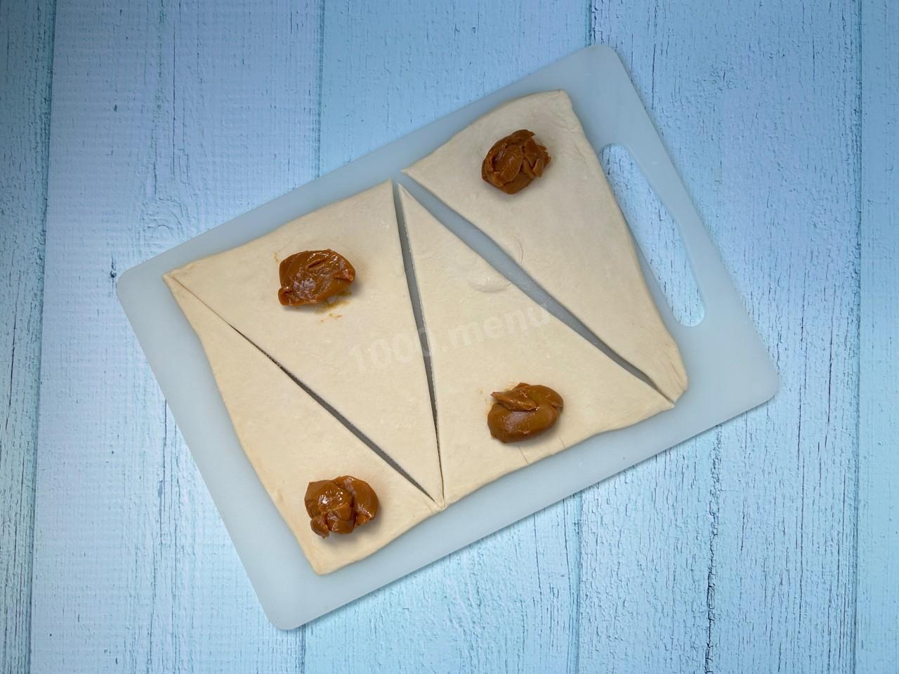 Для начала раскатайте тесто в пласт толщиной примерно 3-4 мм, после этого нарежьте его на треугольники. На широкий край каждого треугольника выложите по 1 чайной ложке вареной сгущенки.