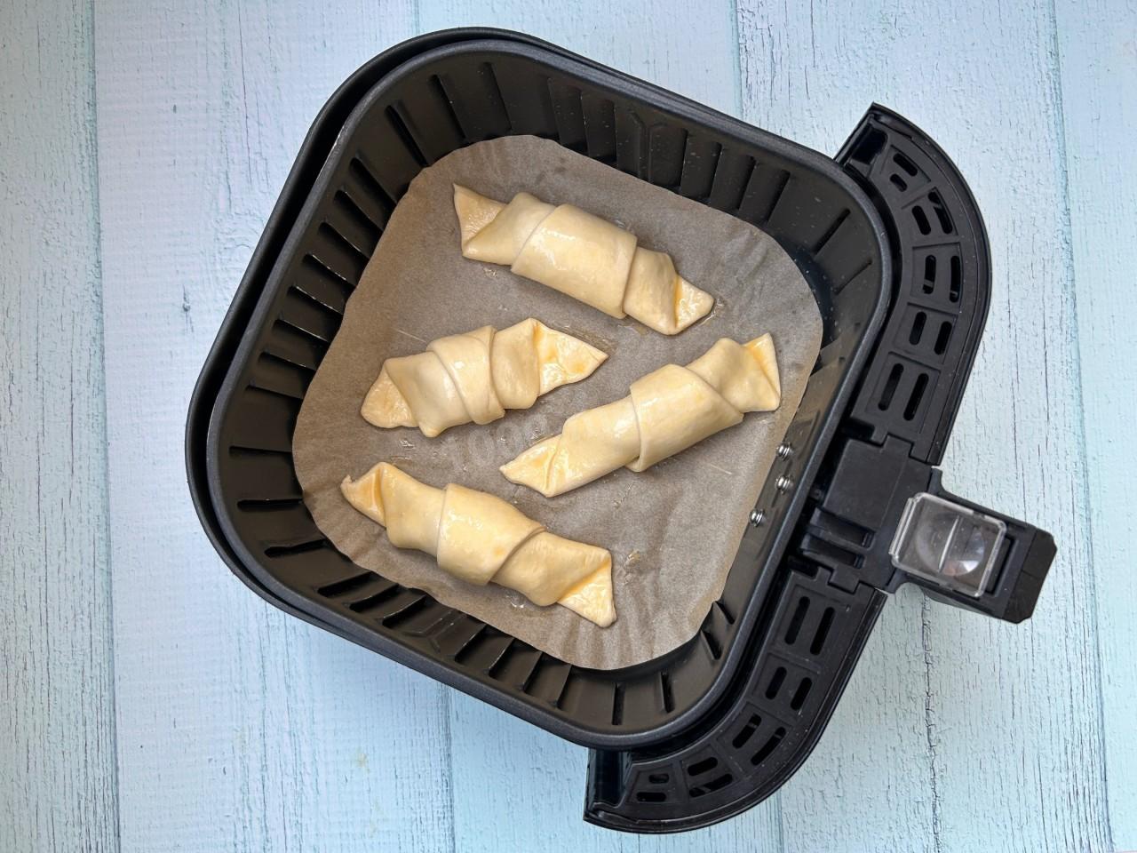 Выложите пергамент в чашу аэрогриля, разместите круассаны на расстоянии друг от друга. Взбейте яйцо и смажьте их сверху. Сколько готовить круассаны в аэрогриле? Готовьте круассаны при температуре 180 градусов 20-25 минут до румяной корочки.