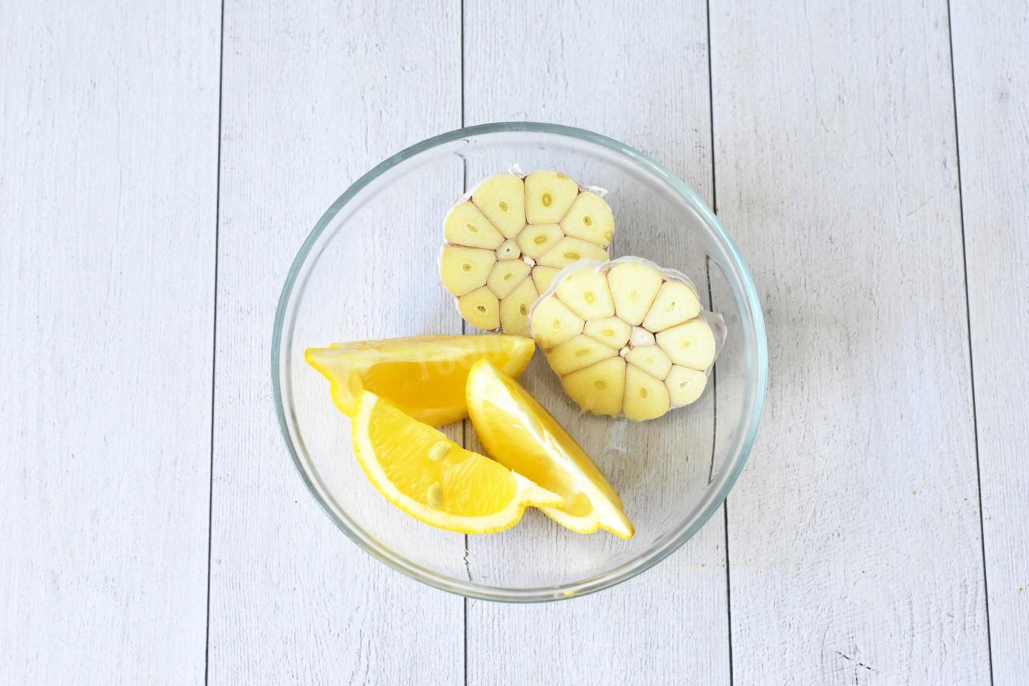 Для начала головку чеснока промойте и разрежьте поперек на две части. Половинку лимона нарежьте дольками. Выложите филе в смазанную растительным маслом форму для запекания. Вокруг разложите половинки чеснока, ломтики лимона и веточки петрушки.