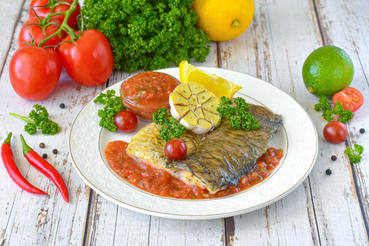 Филе карпа, запеченное в духовке, переложите на тарелку и подавайте к столу. Я подавала рыбу с соусом сальса. Также можно подать филе карпа на подушке из запеченных овощей (цукини, баклажаны, сладкий перец), с картофельным пюре с чесноком или отварным рисом басмати. Приятного аппетита!
